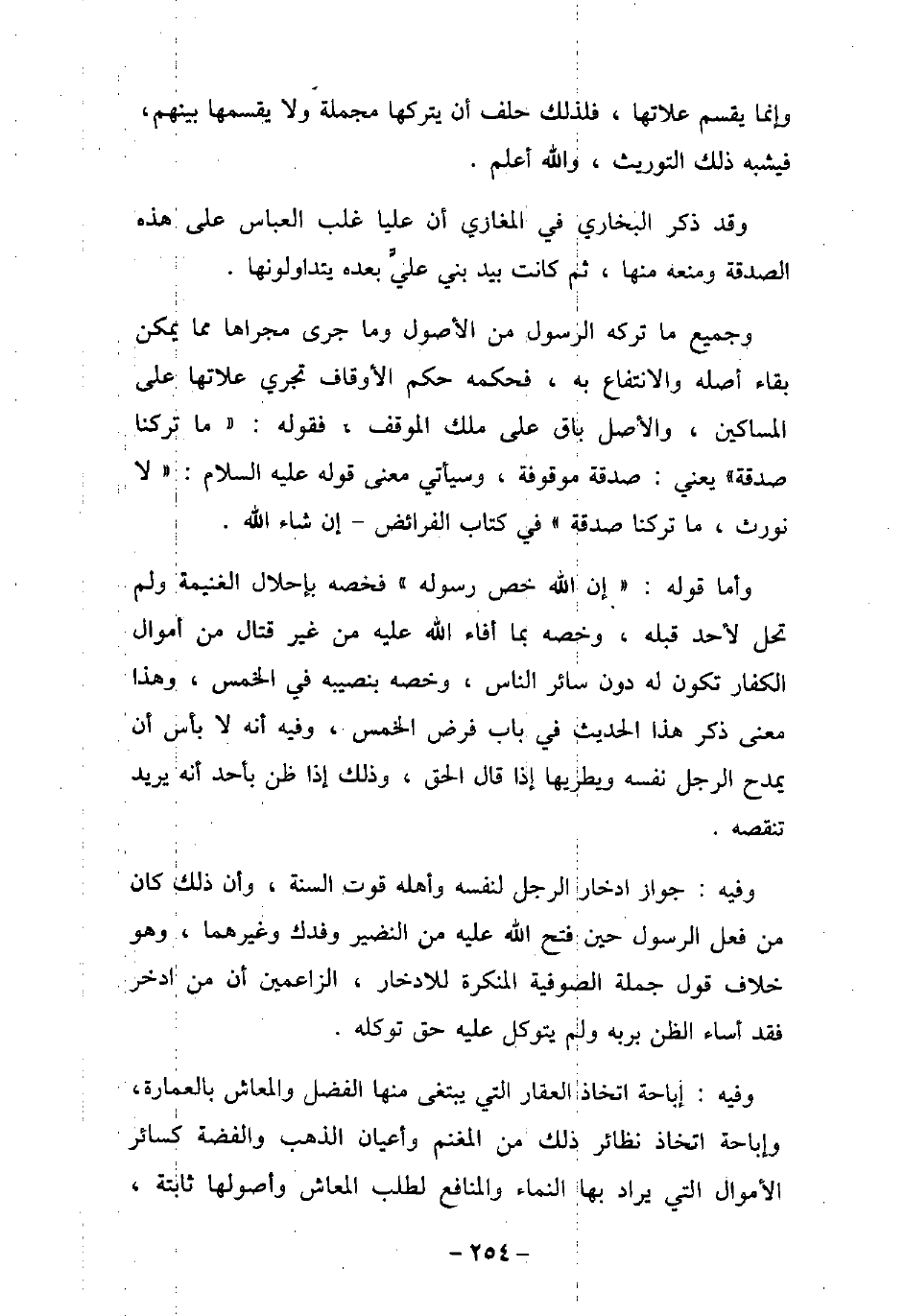 وإنما يقسم علاتها، فلذلك حلف أن يتركها مجملة ولا يقسمها بينهم، فيشبه ذلك التوريث، والله أعلم. وقد ذكر البخارى فى المغازى أن عليا غلب العباس على هذه الصدقة ومنعه منها، ثم كانت بيد بنى على بعده يتداولونها. وجميع ما تركه الرسول من الأصول وما جرى مجراها مما يمكن بقاء أصله والانتفاع به، فحكمه حكم الأوقاف تجرى علاتها على المساكين، والأصل باق على ملك الموقف، فقوله: (ما تركنا صدقة) يعنى: صدقة موقوفة، وسيأتى معنى قوله (صلى الله عليه وسلم) : (لا نورث، ما تركنا صدقة) فى كتاب الفرائض إن شاء الله. وأما قوله: (إن الله خص رسوله) فخصه بإحلال الغنيمة ولم تحل لأحد قبله، وخصه بما أفاء الله عليه من غير قتال من أموال الكفار تكون له دون سائر الناس، وخصه بنصيبه فى الخمس، وهذا معنى ذكر هذا الحديث 4 فى باب فرض الخمس، وفيه أنه لا بأس أن يمدح الرجل نفسه ويطريها إذا قال الحق، وذلك إذا ظن بأحد أنه يريد تنقصه. وفيه: جواز ادخار الرجل لنفسه وأهله قوت السنة، وأن ذلك كان من فعل الرسول حين فتح الله عليه من النضير وفدك وغيرهما، وهو خلاف قول جملة الصوفية المنكرة للادخار، الزاعمين أن من أدخر فقد أساء الظن بربه ولم يتوكل عليه حق توكله. وفيه: إباحة اتخاذ العقار التى يبتغى منها الفضل والمعاش بالعمارة، وإباحة اتخاذ نظائر ذلك من المغنم وأعيان الذهب والفضة كسائر الأموال التى يراد بها النماء والمنافع لطلب المعاش وأصولها ثابتة،
