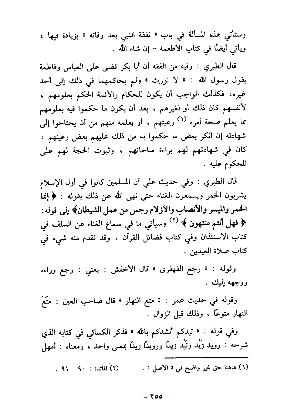 وستأتى هذه المسألة فى باب (نفقة النبى بعد وفاته) بزيادة فيها، ويأتى أيضًا فى كتاب الأطعمة إن شاء الله. قال الطبرى: وفيه من الفقه أن أبا بكر قضى على العباس وفاطمة بقول رسول الله: (لا نورث) ولم يحاكمهما فى ذلك إلى أحد غيره، فكذلك الواجب أن يكون للحكام والأئمة الحكم بعلومهم، لأنفسهم كان ذلك أو لغيرهم، بعد أن يكون ما حكموا فيه بعلومهم مما يعلم صحة أمره رعيتهم، أو يعلمه منهم من أن يحتاجوا إلى شهادته إن أنكر بعض ما حكموا به من ذلك عليهم بعض رعيتهم، كان فى شهادتهم لهم براءة ساحاتهم، وثبوت الحجة لهم على المحكوم عليه. قال الطبرى: وفى حديث على أن المسلمين كانوا فى أول الإسلام يشربون الخمر ويسمعون الغناء حتى نهى الله عن ذلك بقوله: (إنما الخمر والميسر والأنصاب والأزلام رجس من عمل الشيطان (إلى قوله: (فهل أنتم منتهون (وسيأتى ما فى سماع الغناء عن السلف فى كتاب الاستئذان وفى كتاب فضائل القرآن، وقد تقدم منه شيء في كتاب صلاة العيدين. وقوله: (رجع القهقرى) قال الأخفش: يعنى: رجع وراءه ووجهه إليك. وقوله فى حديث عمر: (متع النهار) قال صاحب العين: متع النهار متوعًا، وذلك قبل الزوال. وفى قوله: (تيدكم أنشدكم بالله) فذكر الكسائى فى كتابه الذى شرحه: رويد زيد وتيد زيدًا ورويدًا زيدًا بمعنى واحد، ومعناه: أمهل