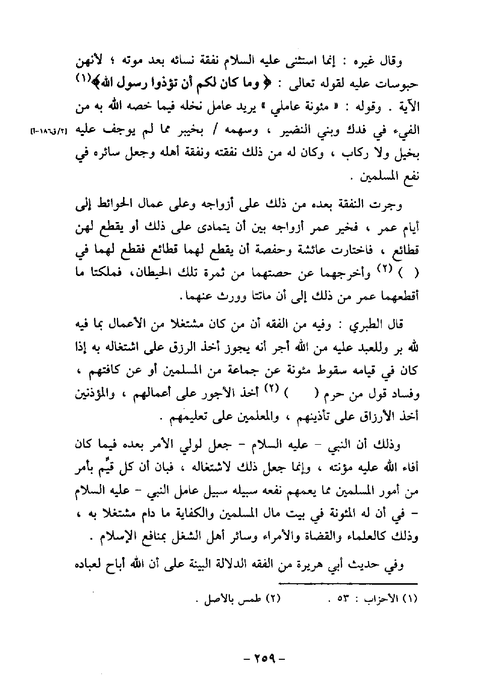 وقال غيره: إنما استثنى (صلى الله عليه وسلم) نفقة نسائه بعد موته؛ لأنهن حبوسات عليه لقوله تعالى: (وما كان لكم أن تؤذوا رسول الله (الآية. وقوله: (مئونة عاملي) يريد عامل نخله فيما خصه الله به من الفيء فى فدك وبنى النضير، وسهمه بخيبر مما لم يوجف عليه بخيل ولا ركاب، وكان له من ذلك نفقته ونفقة أهله وجعل سائره فى نفع المسلمين. وجرت النفقة بعده من ذلك على أزواجه وعلى عمال الحوائط إلى أيام عمر، فخير عمر أزواجه بين أن يتمادى على ذلك أو يقطع لهن قطائع، فاختارت عائشة وحفصة أن يقطع لهما قطائع فقطع لهما فى [. . . . .] وأخرجهما عن حصتهما من ثمرة تلك الحيطان، فملكتا ما أقطعهما عمر من ذلك إلى أن ماتتا وورث عنهما. قال الطبرى: وفيه من الفقه أن من كان مشتغلا من الأعمال بما فيه لله بر وللعبد عليه من الله أجر أنه يجوز أخذ الرزق على اشتغاله به إذا كان فى قيامه سقوط مئونة عن جماعة من المسلمين أو عن كافتهم، وفساد قول من حرم [. . . . .] أخذ الأجور على أعمالهم، والمؤذنين أخذ الأرزاق على تأذينهم، والمعلمين على تعليمهم. وذلك أن النبى (صلى الله عليه وسلم) جعل لولى الأمر بعده فيما كان أفاء الله عليه مؤنته، وإنما جعل ذلك لاشتغاله، فبان أن كل قيم بأمر من أمور المسلمين مما يعمهم نفعه سبيله سبيل عامل النبى (صلى الله عليه وسلم) فى أن له المئونة فى بيت مال المسلمين والكفاية ما دام مشتغلا به، وذلك كالعلماء والقضاة والأمراء وسائر أهل الشغل بمنافع الإسلام. وفى حديث أبى هريرة من الفقه الدلالة البينة على أن الله أباح لعباده