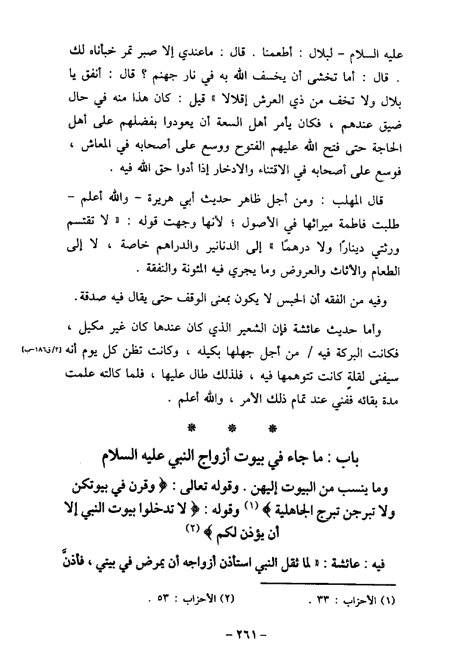 4 - باب مَا جَاءَ فِى بُيُوتِ أَزْوَاجِ النَّبِىِّ (صلى الله عليه وسلم) وَمَا نُسِبَ مِنَ الْبُيُوتِ إِلَيْهِنَّ وقوله تَعَالَى: (وَقَرْنَ فِى بُيُوتِكُنَّ ولا تبرجن تبرج الجاهلية) [الأحزاب: 33] ، وقوله: (لا تَدْخُلُوا بُيُوتَ النَّبِىِّ إِلا أَنْ يُؤْذَنَ لَكُمْ) [الأحزاب: 53]