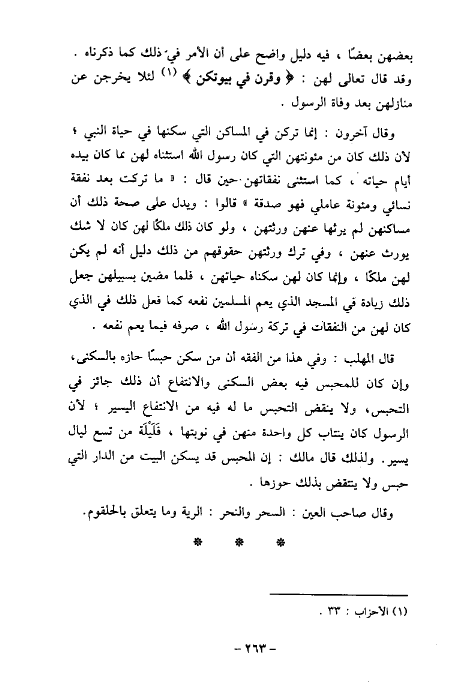 بعضهن بعضًا، فيه دليل واضح على أن الأمر فى ذلك كما ذكرناه. وقد قال تعالى لهن: (وقرن فى بيوتكن (لئلا يخرجن عن منازلهن بعد وفاة الرسول. وقال آخرون: إنما تركن فى المساكن التى سكنها فى حياة النبى؛ لأن ذلك كان من مئونتهن التى كان رسول الله استثناه لهن مما كان بيده أيام حياته، كما استثنى نفقاتهن حين قال: (ما تركت بعد نفقة نسائى ومئونة عاملى فهو صدقة) قالوا: ويدل على صحة ذلك أن مساكنهن لم يرثها عنهن ورثتهن، ولو كان ذلك ملكًا لهن كان لا شك يورث عنهن، وفى ترك ورثتهن حقوقهم من ذلك دليل أنه لم يكن لهن ملكًا، وإنما كان لهن سكناه حياتهن، فلما مضين بسبيلهن جعل ذلك زيادة فى المسجد الذى يعم المسلمين نفعه كما فعل ذلك فى الذى كان لهن من النفقات فى تركة رسول الله، صرفه فيما يعم نفعه. قال المهلب: وفى هذا من الفقه أن من سكن حبسًا حازه بالسكنى، وإن كان للمحبس فيه بعض السكنى والانتفاع أن ذلك جائز فى التحبس، ولا ينقض التحبس ما له فيه من الانتفاع اليسير؛ لأن الرسول كان ينتاب كل واحدة منهن فى نوبتها، فليلة من تسع ليال يسير. ولذلك قال مالك: إن المحبس قد يسكن البيت من الدار التى حبس ولا ينتقض بذلك حوزها. وقال صاحب العين: السحر والنحر: الرية وما يتعلق بالحلقوم.