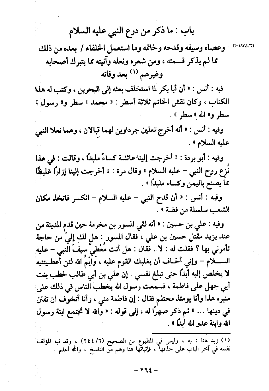 . 1918 / فيه: أَنَس، أَنَّ أَبَا بَكْرٍ لَمَّا اسْتُخْلِفَ بَعَثَهُ إِلَى الْبَحْرَيْنِ، وَكَتَبَ لَهُ هَذَا الْكِتَابَ، وَكَانَ نَقْشُ الْخَاتَمِ ثَلاثَةَ أَسْطُرٍ: (مُحَمَّدٌ سَطْرٌ، وَرَسُولُ سَطْرٌ، وَاللَّهِ سَطْرٌ) . 1919 / وفيه: أَنَس، أَنَّهُ أَخْرَجَ نَعْلَيْنِ جَرْدَاوَيْنِ لَهُمَا قِبَالانِ، وهما نَعْلا النَّبِىِّ، (صلى الله عليه وسلم) . 1920 / وفيه: أَبُو بُرْدَةَ، أَخْرَجَتْ إِلَيْنَا عَائِشَةُ كِسَاءً مُلَبَّدًا، وَقَالَتْ: فِى هَذَا نُزِعَ رُوحُ النَّبِىِّ، (صلى الله عليه وسلم) . وَقَالَ مرة: أَخْرَجَتْ إِلَيْنَا إِزَارًا غَلِيظًا مِمَّا يُصْنَعُ بِالْيَمَنِ، وَكِسَاءً مِنْ مُلَبَّدًا. 1921 / وفيه: أَنَس، أَنَّ قَدَحَ النَّبِىِّ، (صلى الله عليه وسلم) ، انْكَسَرَ، فَاتَّخَذَ مَكَانَ الشَّعْبِ سِلْسِلَةً مِنْ فِضَّةٍ. 1922 / - وفيه: عَلِىّ بْنَ حُسَيْنٍ، أنَّهُ لَقِى الْمِسْوَرُ بْنُ مَخْرَمَةَ، حِينَ قَدِم الْمَدِينَةَ مِنْ عِنْدِ يَزِيدَ مَقْتَلَ حُسَيْنِ بْنِ عَلِىٍّ، فَقَالَ الْمِسْوَرُ: هَلْ لَكَ إِلَىَّ مِنْ حَاجَةٍ تَأْمُرُنِى بِهَا؟ فَقُلْتُ لَهُ: لا، فَقَالَ لَهُ: فَهَلْ أَنْتَ مُعْطِىَّ سَيْفَ النَّبِى، (صلى الله عليه وسلم) ، فَإِنِّى أَخَافُ أَنْ يَغْلِبَكَ الْقَوْمُ عَلَيْهِ؟ وَايْمُ اللَّهِ لَئِنْ أَعْطَيْتَنِيهِ لا يُخْلَصُ إِلَيْهِمْ أَبَدًا حَتَّى تُبْلَغَ نَفْسِى، إِنَّ عَلِىَّ بْنَ أَبِى طَالِبٍ خَطَبَ ابْنَةَ أَبِى جَهْلٍ عَلَى فَاطِمَةَ عَلَيْهَا السَّلام فَسَمِعْتُ رَسُولَ اللَّهِ (صلى الله عليه وسلم) يَخْطُبُ النَّاسَ فِى ذَلِكَ عَلَى مِنْبَرِهِ هَذَا، وَأَنَا يَوْمَئِذٍ مُحْتَلِمٌ، فَقَالَ: إِنَّ فَاطِمَةَ مِنِّى، وَأَنَا أَتَخَوَّفُ أَنْ تُفْتَنَ فِى دِينِهَا، ثُمَّ ذَكَرَ صِهْرًا لَهُ إِلىَ قَوْلِهِ: وَاللَّهِ لا تَجْتَمِعُ ابْنَةُ رَسُولِ اللَّهِ (صلى الله عليه وسلم) ابْنَةُ عَدُوِّ اللَّهِ أَبَدًا) .