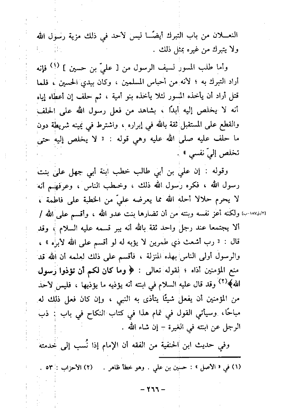 النعلان من باب التبرك أيضًا ليس لأحد فى ذلك مزية رسول الله ولا يتبرك من غيره بمثل ذلك. وأما طلب المسور لسيف الرسول من على بن حسين، فإنه أراد التبرك به؛ لأنه من أحباس المسلمين، وكان بيدى الحسين، فلما قتل أراد أن يأخذه المسور لئلا يأخذه بنو أمية، ثم حلف إن أعطاه إياه أنه لا يخلص إليه أبدًا، بشاهد من فعل رسول الله على الحلف والقطع على المستقبل ثقة بالله فى إبراره، واشترط فى يمينه شريطة دون ما حلف عليه صلى الله عليه وهى قوله: (لا يخلص إليه حتى تخلص إلى نفسي) . وقوله: إن على بن أبى طالب خطب ابنة أبى جهل على بنت رسول الله، فكره رسول الله ذلك، وخطب الناس، وعرفهم أنه لا يحرم حلالا أحله الله مما يعرضه على من الخطبة على فاطمة، ولكنه أعز نفسه وبنته من أن تضارها بنت عدو الله، وأقسم على الله ألا يجتمعا عند رجل واحد ثقة بالله أنه يبر قسمه (صلى الله عليه وسلم) ، وقد قال: (رب أشعث ذى طمرين لا يؤبه له لو أقسم على الله لأبره) ، والرسول أولى الناس بهذه المنزلة، فأقسم على ذلك لعلمه أن الله قد منع المؤمنين أذاه؛ لقوله تعالى: (وما كان لكم أن تؤذوا رسول الله (وقد قال (صلى الله عليه وسلم) في ابنته أنه يؤذيه ما يؤذيها، فليس لأحد من المؤمنين أن يفعل شيئًا يتأذى به النبى، وإن كان فعل ذلك له مباحًا، وسيأتى القول فى تمام هذا فى كتاب النكاح فى باب: ذب الرجل عن ابنته فى الغيرة إن شاء الله. وفى حديث ابن الحنفية من الفقه أن الإمام إذا نسب إلى خدمته