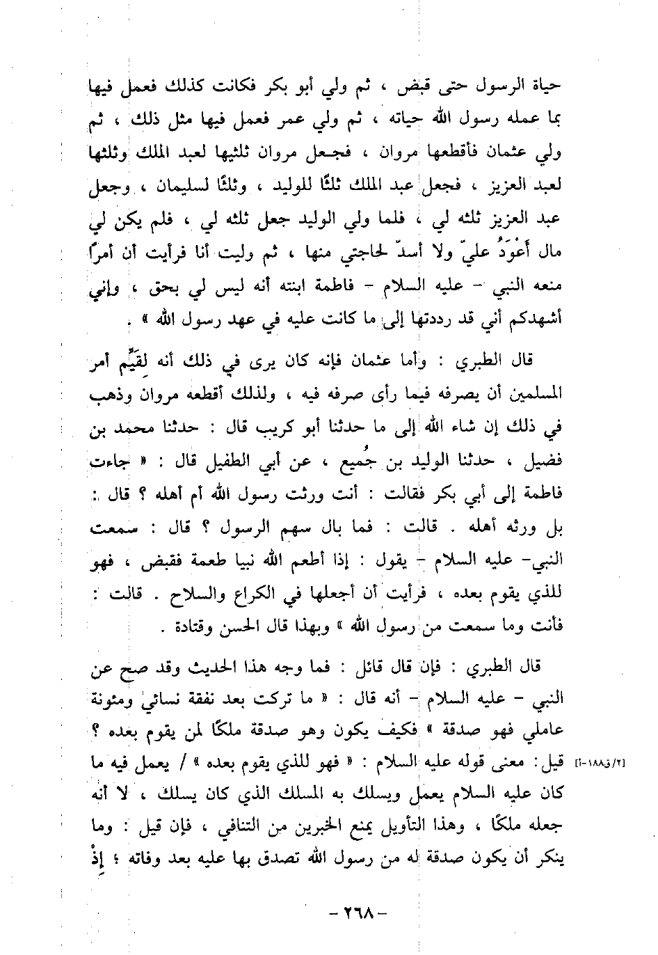 حياة الرسول حتى قبض، ثم ولى أبو بكر فكانت كذلك فعمل فيها بما عمله رسول الله حياته، ثم ولى عمر فعمل فيها مثل ذلك، ثم ولى عثمان فأقطعها مروان، فجعل مروان ثلثيها لعبد الملك وثلثها لعبد العزيز، فجعل عبد الملك ثلثًا للوليد، وثلثًا لسليمان، وجعل عبد العزيز ثلثه لى، فلما ولى الوليد جعل ثلثه لى، فلم يكن لى مال أعود على ولا أسد لحاجتى منها، ثم وليت أنا فرأيت أن أمرًا منعه النبى (صلى الله عليه وسلم) فاطمة ابنته أنه ليس لى بحق، وإنى أشهدكم أنى قد رددتها إلى ما كانت عليه فى عهد رسول الله) . قال الطبرى: وأما عثمان فإنه كان يرى فى ذلك أنه لقيم أمر المسلمين أن يصرفه فيما رأى صرفه فيه، ولذلك أقطعه مروان وذهب فى ذلك إن شاء الله إلى ما حدثنا أبو كريب قال: حدثنا محمد بن فضيل، حدثنا الوليد بن جميع، عن أبى الطفيل قال: (جاءت فاطمة إلى أبى بكر فقالت: أنت ورثت رسول الله أم أهله؟ قال: بل ورثه أهله. قالت: فما بال سهم الرسول؟ قال: سمعت النبى - (صلى الله عليه وسلم) يقول: (إذا أطعم الله نبيا طعمة فقبض، فهو للذى يقوم بعده، فرأيت أن أجعلها فى الكراع والسلاح) . قالت: فأنت وما سمعت من رسول الله) وبهذا قال الحسن وقتادة. قال الطبرى: فإن قال قائل: فما وجه هذا الحديث وقد صح عن النبى (صلى الله عليه وسلم) أنه قال: (ما تركت بعد نفقة نسائى ومئونة عاملى فهو صدقة) فكيف يكون وهو صدقة ملكًا لمن يقوم بعده؟ قيل: معنى قوله (صلى الله عليه وسلم) : (فهو للذى يقوم بعده) يعمل فيه ما كان (صلى الله عليه وسلم) يعمل ويسلك به المسلك الذى كان يسلك، لا أنه جعله ملكًا، وهذا التأويل يمنع الخبرين من التنافى. فإن قيل: وما ينكر أن يكون صدقة له من رسول الله تصدق بها عليه بعد وفاته؛ إذ