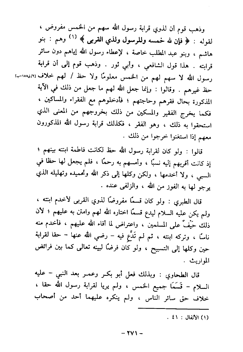 وذهب قوم أن لذوى قرابة رسول الله سهم من الخمس مفروض، لقوله: (فإن لله خمسه وللرسول ولذى القربى (وهم: بنو هاشم، وبنو عبد المطلب خاصة، لإعطاء رسول الله إياهم دون سائر قرابته. هذا قول الشافعى، وأبى ثور. وذهب قوم إلى أن قرابة رسول الله لا سهم لهم من الخمس معلومًا ولا حظ لهم خلاف حظ غيرهم. وقالوا: وإنما جعل الله لهم ما جعل من ذلك فى الآية المذكورة بحال فقرهم وحاجتهم؛ فأدخلوهم مع الفقراء والمساكين، فكما يخرج الفقير والمسكين من ذلك بخروجهم من المعنى الذى استحقوا به ذلك، وهو الفقر، فكذلك قرابة رسول الله المذكورون معهم إذا استغنوا خرجوا من ذلك. قالوا: ولو كان لقرابة رسول الله حظ لكانت فاطمة ابنته بينهم؛ إذ كانت أقربهم إليه نسبًا، وأمسهم به رحمًا، فلم يجعل لها حظا فى السبى، ولا أخدمها، ولكن وكلها إلى ذكر الله وتحميده وتهليله الذى يرجو لها به الفوز من الله، والزلفى عنده. قال الطبرى: ولو كان قسمًا مفروضًا لذوى القربى لأخدم ابنته، ولم يكن (صلى الله عليه وسلم) ليدع قسمًا اختاره الله لهم وامتن به عليهم؛ لأن ذلك حيف على المسلمين، واعتراض لما أفاء الله عليهم، فأخدم منه ناسًا، وتركه ابنته، ثم لم تدع فيه رضى الله عنها حقا لقرابة حين وكلها إلى التسبيح، ولو كان فرضًا لبينه تعالى كما بين فرائض المواريث. قال الطحاوى: وبذلك فعل أبو بكر وعمر بعد النبى (صلى الله عليه وسلم) قسما جميع الخمس، ولم يريا لقرابة رسول الله حقا، خلاف حق سائر الناس، ولم ينكره عليهما أحد من أصحاب