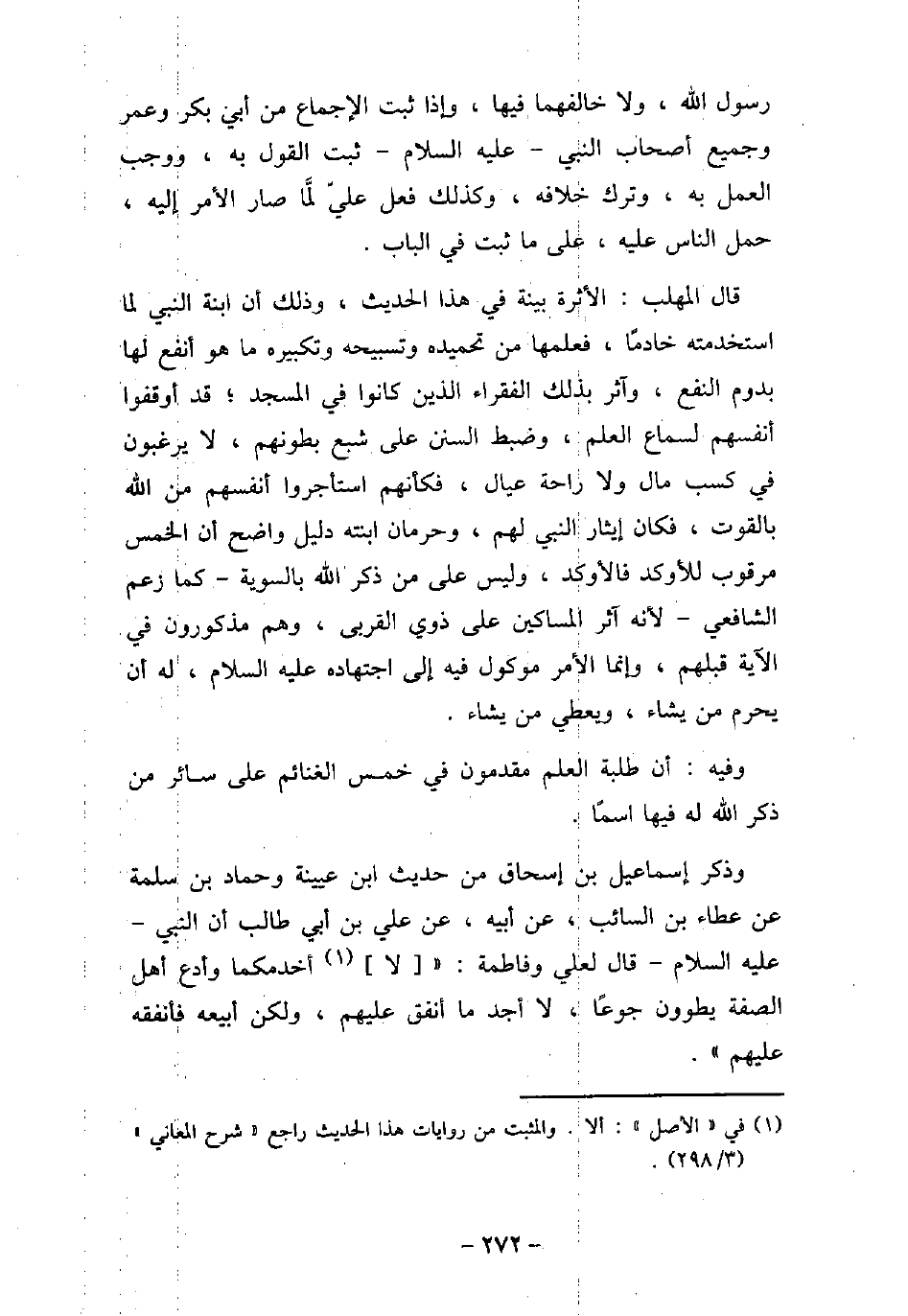 رسول الله، ولا خالفهما فيها، إذا ثبت الإجماع من أبى بكر وعمر وجميع أصحاب النبى عليه السلام ثبت القول به، ووجب العمل به، وترك خلافه، وكذلك فعل على لما صار الأمر إليه، حمل الناس عليه، على ما ثبت فى الباب. قال المهلب: الأثرة بينة فى هذا الحديث، وذلك أن ابنة النبى لما استخدمته خادمًا، فعلمها من تحميده وتسبيحه وتكبيره ما هو أنفع لها بدوم النفع، وآثر بذلك الفقراء الذين كانوا فى المسجد؛ قد أوقفوا أنفسهم لسماع العلم، وضبط السنن على شبع بطونهم، لا يرغبون فى كسب مال ولا راحة عيال، فكأنهم استأجروا أنفسهم من الله بالقوت، فكان إيثار النبى لهم، وحرمان ابنته دليل واضح أن الخمس مرقوب للأوكد فالأوكد، وليس على من ذكر الله بالسوية كما زعم الشافعى لأنه آثر المساكين على ذوى القربى، وهم مذكورون فى الآية قبلهم، وإنما الأمر موكول فيه إلى اجتهاده (صلى الله عليه وسلم) ، له أن يحرم من يشاء، ويعطى من يشاء. وفيه: أن طلبة العلم مقدمون فى خمس الغنائم على سائر من ذكر الله له فيها اسمًا. وذكر إسماعيل بن إسحاق من حديث ابن عيينة وحماد بن سلمة عن عطاء بن السائب، عن أبيه، عن على بن أبى طالب أن النبى (صلى الله عليه وسلم) قال لعلى وفاطمة: (لا أخدمكما وأدع أهل الصفة يطوون جوعًا، لا أجد ما أنفق عليهم، ولكن أبيعه فأنفقه عليهم) .