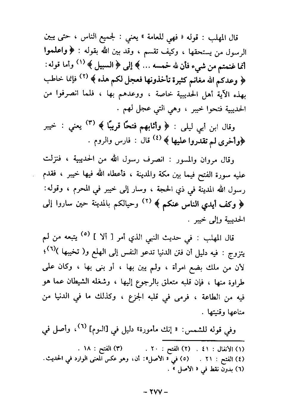 قال المهلب: قوله (فهى للعامة) يعنى: لجميع الناس، حتى يبين الرسول من يستحقها، وكيف تقسم، وقد بين الله بقوله: (واعلموا أنما غنمتهم من شيء فأن لله خمسه (إلى) السبيل (وأما قوله: (وعدكم الله مغانم كثيرة تأخذونها فعجل لكم هذه (فإنما خاطب بهذه الآية أهل الحديبية خاصة، ووعدهم بها، فلما انصرفوا من الحديبية فتحوا خيبر، وهى التى عجل لهم. وقال ابن أبى ليلى: (وأثابهم فتحًا قريبًا (يعنى: خيبر) وأخرى لم تقدروا عليها (قال: فارس والروم. وقال مروان والمسور: انصرف رسول الله من الحديبية، فنزلت عليه سورة الفتح فيما بين مكة والمدينة، فأعطاه الله فيها خيبر، فقدم رسول الله المدينة فى ذى الحجة، وسار إلى خيبر فى المحرم، وقوله: (وكف أيدى الناس عنكم (وحيالكم بالمدينة حين ساروا إلى الحديبية وإلى خيبر. قال المهلب: فى حديث النبى الذى أمر ألا يتبعه من لم يتزوج: فيه دليل أن فتن الدنيا تدعو النفس إلى الهلع وتخيبها؛ لأن من ملك بضع امرأة، ولم يبن بها، أو بنى بها، وكان على طراوة منها، فإن قلبه متعلق بالرجوع إليها، وشغله الشيطان عما هو فيه من الطاعة، فرمى فى قلبه الجزع، وكذلك ما فى الدنيا من متاعها وقنيتها. وفى قوله للشمس: (إنك مأمورة) دليل فى الوم، وأصل فى