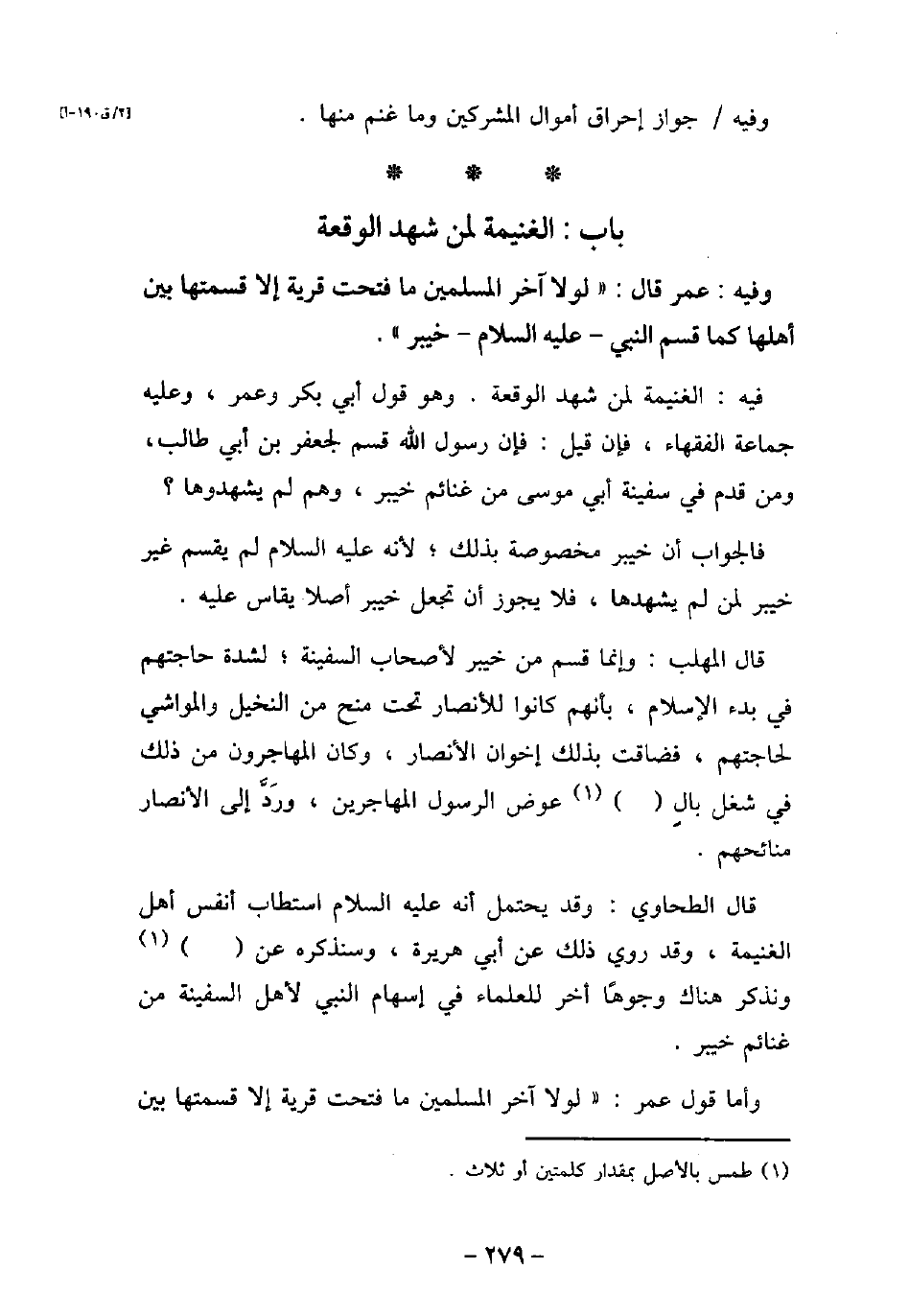 934 / - وفيه: عُمَرَ، قَالَ: لَوْلا آخِرُ الْمُسْلِمِينَ، مَا فَتَحْتُ قَرْيَةً إِلا قَسَمْتُهَا بَيْنَ أَهْلِهَا كَمَا قَسَمَ النَّبِىُّ، (صلى الله عليه وسلم) ، خَيْبَرَ. فيه: الغنيمة لمن شهد الوقعة. وهو قول أبى بكر وعمر، وعليه جماعة الفقهاء. فإن قيل: فإن رسول الله قسم لجعفر بن أبى طالب، ومن قدم فى سفينة أبى موسى من غنائم خيبر، وهم لم يشهدوها؟ فالجواب: أن خيبر مخصوصة بذلك؛ لأنه (صلى الله عليه وسلم) لم يقسم غير خيبر لمن لم يشهدها، فلا يجوز أن تجعل خيبر أصلا يقاس عليه. قال المهلب: وإنما قسم من خيبر لأصحاب السفينة؛ لشدة حاجتهم فى بدء الإسلام، بأنهم كانوا للأنصار تحت منح من النخيل والمواشى لحاجتهم، فضاقت بذلك إخوان الأنصار، وكان المهاجرون من ذلك فى شغل بال [. . . .] عوض الرسول المهاجرين، ورد إلى الأنصار منائحهم. قال الطحاوى: وقد يحتمل أنه (صلى الله عليه وسلم) استطاب أنفس أهل الغنيمة، وقد روى ذلك عن أبى هريرة، وسنذكره عن [. . . . .] ونذكر هناك وجوهًا أخر للعلماء فى إسهام النبى لأهل السفينة من غنائم خيبر. واما قول عمر: (لولا آخر المسلمين ما فتحت قرية إلا قسمتها بين