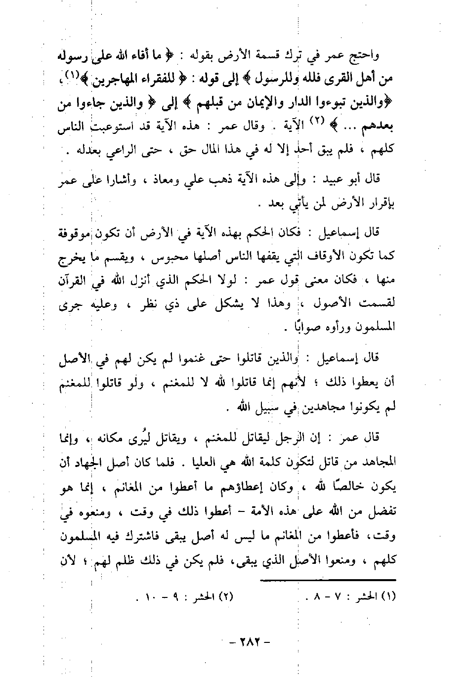 واحتج عمر فى ترك قسمة الأرض بقوله: (ما أفاء الله على رسوله من أهل القرى فلله وللرسول (إلى قوله: (للفقراء المهاجرين (،) والذين تبوؤوا الدار والإيمان من قبلهم (إلى) والذين جاءوا من بعدهم (الآية. وقال عمر: هذه الآية قد استوعبت الناس كلهم، فلم يبق أحد إلا له فى هذا المال حق، حتى الراعى بعدله. قال أبو عبيد: وإلى هذه الآية ذهب على ومعاذ، وأشارا على عمر بإقرار الأرض لمن يأتى بعد. قال إسماعيل: فكان الحكم بهذه الآية فى الأرض أن تكون موقوفة كما تكون الأوقاف التى يقفها الناس أصلها محبوس، ويقسم ما يخرج منها، فكان معنى قول عمر: لولا الحكم الذى أنزل الله فى القرآن لقسمت الأصول، وهذا لا يشكل على ذى نظر، وعليه جرى المسلمون ورأوه صوابًا. قال إسماعيل: والذين قاتلوا حتى غنموا لم يكن لهم فى الأصل أن يعطوا ذلك؛ لأنهم إنما قاتلوا لله لا للمغنم، ولو قاتلوا للمغنم لم يكونوا مجاهدين فى سبيل الله. قال عمر: إن الرجل ليقاتل للمغنم، ويقاتل ليرى مكانه، وإنما المجاهد من قاتل لتكون كلمة الله هى العليا. فلما كان أصل الجهاد أن يكون خالصًا لله، وكان إعطاؤهم ما أعطوا من المغانم، إنما هو تفضل من الله على هذه الأمة أعطوا ذلك فى وقت، ومنعوه فى وقت، فأعطوا من المغانم ما ليس له أصل يبقى فاشترك فيه المسلمون كلهم، ومنعوا الأصل الذى يبقى، فلم يكن فى ذلك ظلم لهم؛ لأن