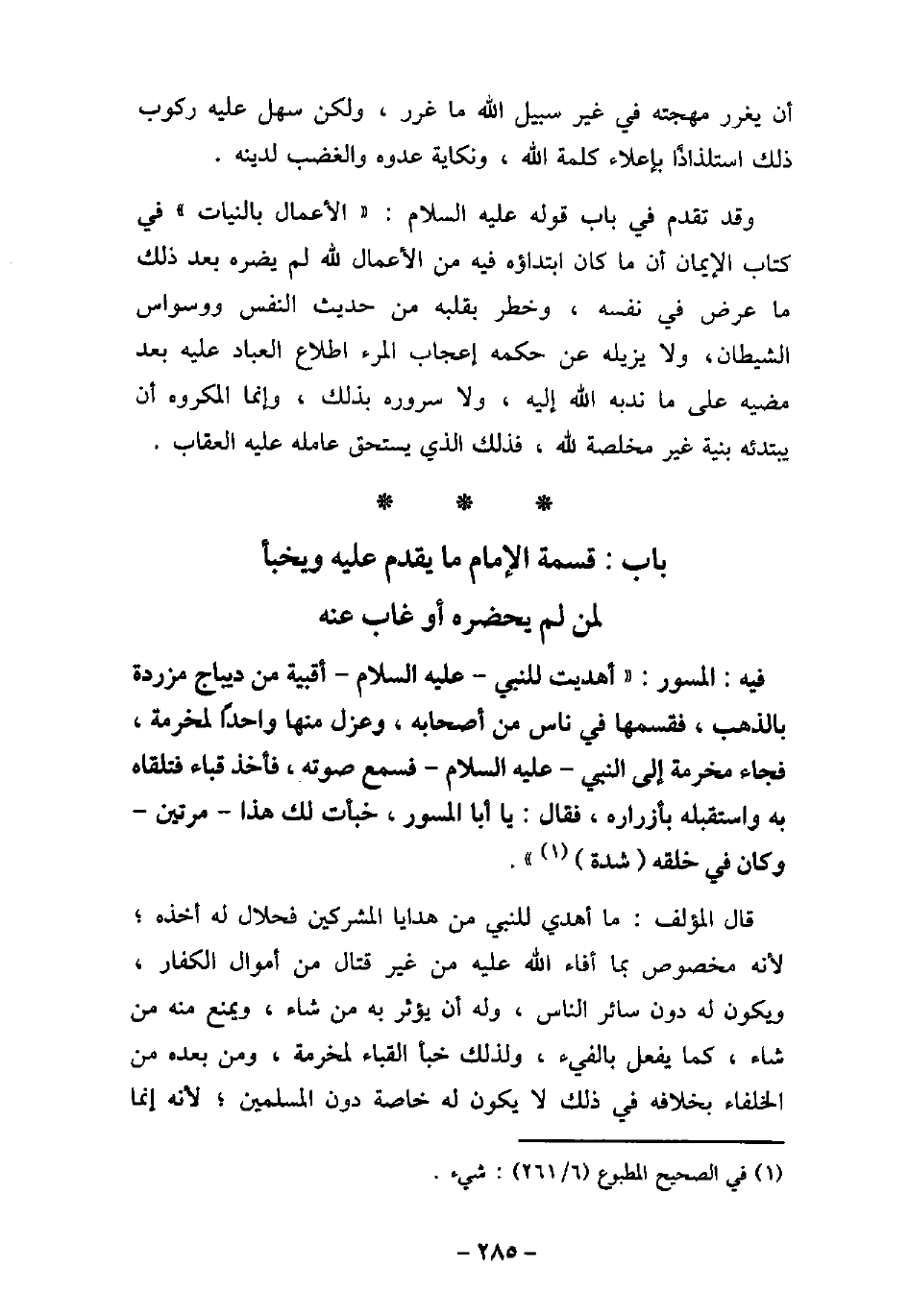 - باب قِسْمَةِ الإمَامِ مَا يَقْدَمُ عَلَيْهِ وَيَخْبَأُ لِمَنْ لَمْ يَحْضُرْهُ أَوْ غَابَ عَنْهُ