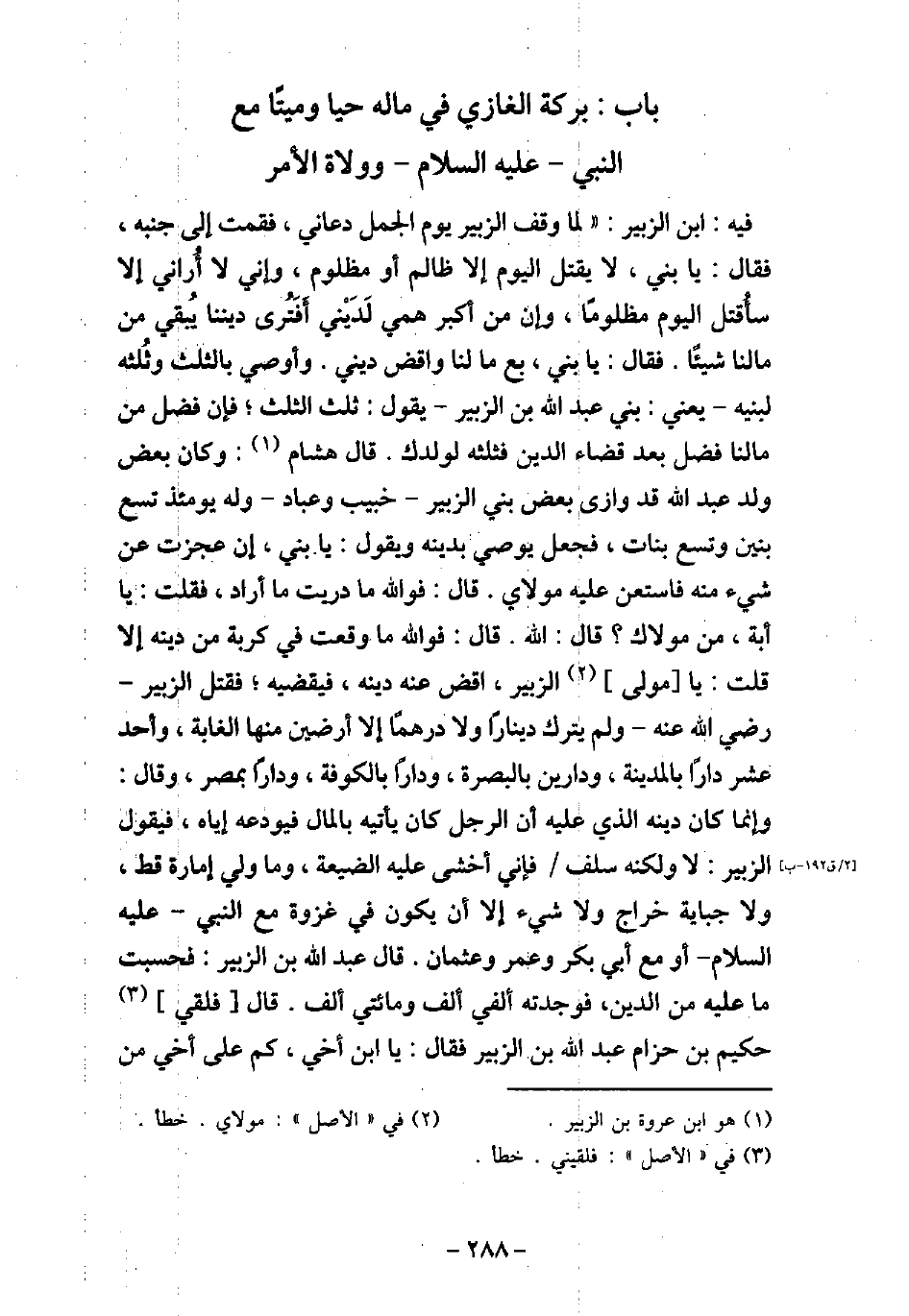 938 / فيه: ابْن الزُّبَيْر، لَمَّا وَقَفَ الزُّبَيْرُ يَوْمَ الْجَمَلِ دَعَانِى، فَقُمْتُ إِلَى جَنْبِهِ، فَقَالَ: يَا بُنَىِّ، إِنَّهُ لا يُقْتَلُ الْيَوْمَ إِلا ظَالِمٌ أَوْ مَظْلُومٌ، وَإِنِّى لا أُرَانِى إِلا سَأُقْتَلُ الْيَوْمَ مَظْلُومًا، وَإِنَّ مِنْ أَكْبَرِ هَمِّى لَدَيْنِى أَفَتُرَى يُبْقِى دَيْنُنَا مِنْ مَالِنَا شَيْئًا، فَقَالَ: يَا بُنَىِّ، بِعْ مَالَنَا، فَاقْضِ دَيْنِى، وَأَوْصَى بِالثُّلُثِ، وَثُلُثِهِ لِبَنِيهِ - يَعْنِى بَنِى عَبْدِاللَّهِ بْنِ الزُّبَيْرِ - يَقُولُ: ثُلُثُ الثُّلُثِ، فَإِنْ فَضَلَ مِنْ مَالِنَا فَضْلٌ بَعْدَ قَضَاءِ الدَّيْنِ شَيْءٌ، فَثُلُثُهُ لِوَلَدِكَ. قَالَ هِشَامٌ: وَكَانَ بَعْضُ وَلَدِ عَبْدِاللَّهِ قَدْ وَازَى بَعْضَ بَنِى الزُّبَيْرِ خُبَيْبٌ وَعَبَّادٌ، وَلَهُ يَوْمَئِذٍ تِسْعَةُ بَنِينَ وَتِسْعُ بَنَاتٍ فَجَعَلَ يُوصِيى بِدَيْنِهِ، وَيَقُولُ: يَا بُنَىِّ، إِنْ عَجَزْتَ عَنْ شَيْءٍ مِنْهُ، فَاسْتَعِنْ عَلَيْهِ مَوْلاىَ، قَالَ: فَوَاللَّهِ، مَا دَرَيْتُ مَا أَرَادَ حَتَّى قُلْتُ: يَا أَبَةِ، مَنْ مَوْلاكَ؟ قَالَ: اللَّهُ، قَالَ: فَوَاللَّهِ مَا وَقَعْتُ فِى كُرْبَةٍ مِنْ دَيْنِهِ إِلا قُلْتُ: يَا مَوْلَى الزُّبَيْرِ، اقْضِ عَنْهُ دَيْنَهُ، فَيَقْضِيهِ، فَقُتِلَ الزُّبَيْرُ رَضِى اللَّهُ عَنْهُ، وَلَمْ يَتْركْ دِينَارًا وَلا دِرْهَمًا إِلا أَرَضِينَ مِنْهَا الْغَابَةُ وَإِحْدَى عَشْرَةَ دَارًا بِالْمَدِينَةِ وَدَارَيْنِ بِالْبَصْرَةِ وَدَارًا بِالْكُوفَةِ وَدَارًا بِمِصْرَ، قَالَ: وَإِنَّمَا كَانَ دَيْنُهُ الَّذِى عَلَيْهِ أَنَّ الرَّجُلَ كَانَ يَأْتِيهِ بِالْمَالِ فَيَسْتَوْدِعُهُ إِيَّاهُ، فَيَقُولُ الزُّبَيْرُ: لا وَلَكِنَّهُ سَلَفٌ، فَإِنِّى أَخْشَى عَلَيْهِ الضَّيْعَةَ، وَمَا وَلِىَ إِمَارَةً قَطُّ وَلا جِبَايَةَ خَرَاجٍ وَلا شَيْئًا إِلا أَنْ يَكُونَ فِى غَزْوَةٍ مَعَ النَّبِىِّ (صلى الله عليه وسلم) أَوْ مَعَ أَبِى بَكْرٍ وَعُمَرَ وَعُثْمَانَ رَضِى اللَّهُ عَنْهُمْ، قَالَ عَبْدُاللَّهِ بْنُ الزُّبَيْرِ: فَحَسَبْتُ مَا عَلَيْهِ مِنَ الدَّيْنِ، فَوَجَدْتُهُ أَلْفَىْ أَلْفٍ وَمِائَتَىْ أَلْفٍ، قَالَ: فَلَقِىَ حَكِيمُ ابْنُ حِزَامٍ عَبْدَاللَّهِ بْنَ الزُّبَيْرِ، فَقَالَ: يَا ابْنَ أَخِى، كَمْ عَلَى أَخِى مِنَ