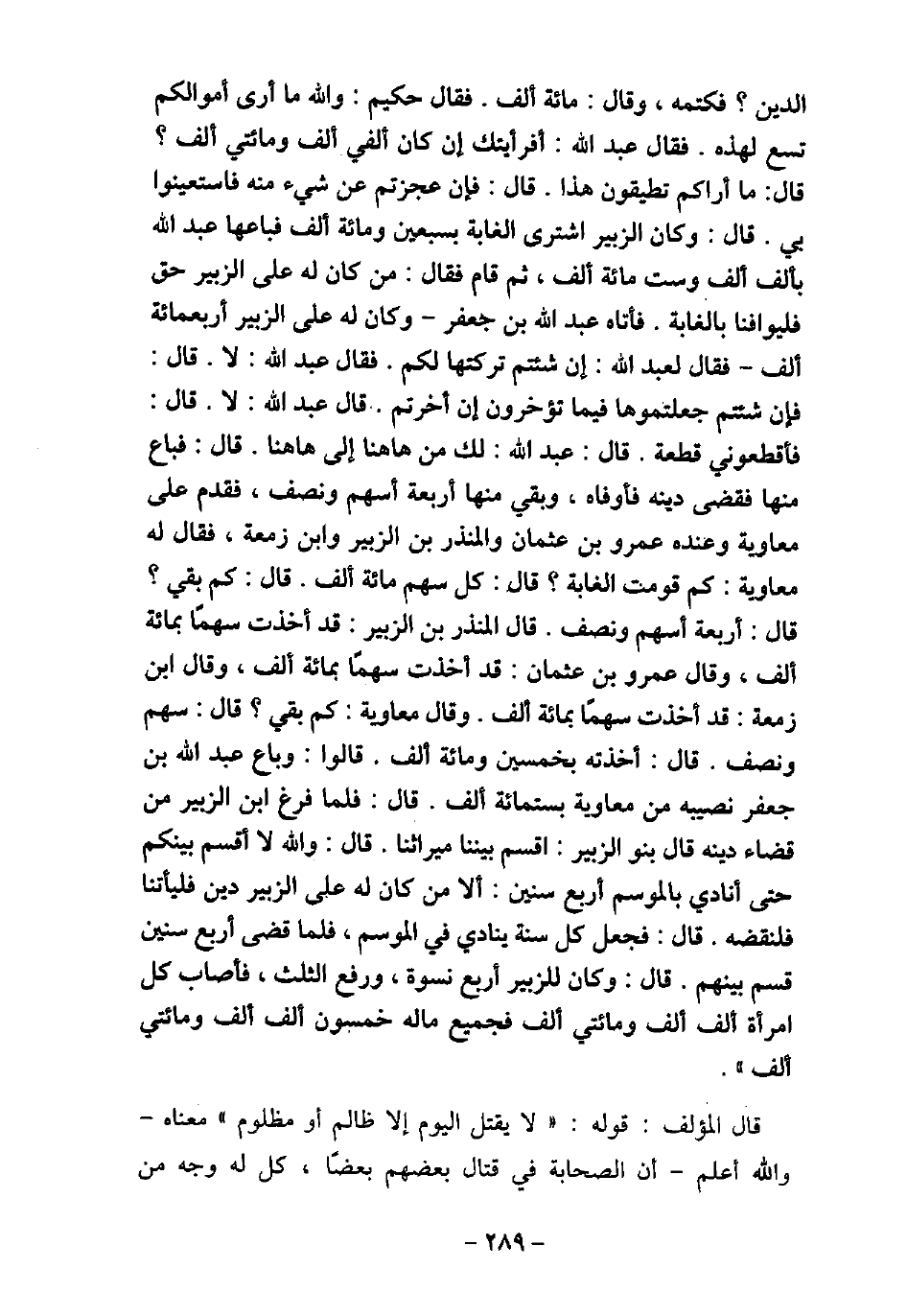 الدَّيْنِ؟ فَكَتَمَهُ، وَقَالَ: مِائَةُ أَلْفٍ، فَقَالَ حَكِيمٌ: وَاللَّهِ مَا أُرَى أَمْوَالَكُمْ تَسَعُ لِهَذِهِ، فَقَالَ لَهُ عَبْدُاللَّهِ: أَفَرَأَيْتَكَ إِنْ كَانَتْ أَلْفَىْ أَلْفٍ وَمِائَتَىْ أَلْفٍ، قَالَ: مَا أُرَاكُمْ تُطِيقُونَ هَذَا، فَإِنْ عَجَزْتُمْ عَنْ شَيْءٍ مِنْهُ، فَاسْتَعِينُوا بِى، قَالَ: وَكَانَ الزُّبَيْرُ اشْتَرَى الْغَابَةَ بِسَبْعِينَ وَمِائَةِ أَلْفٍ، فَبَاعَهَا عَبْدُاللَّهِ بِأَلْفِ أَلْفٍ وَسِتِّ مِائَةِ أَلْفٍ، ثُمَّ قَامَ، فَقَالَ: مَنْ كَانَ لَهُ عَلَى الزُّبَيْرِ حَقٌّ، فَلْيُوَافِنَا بِالْغَابَةِ، فَأَتَاهُ عَبْدُاللَّهِ بْنُ جَعْفَرٍ، وَكَانَ لَهُ عَلَى الزُّبَيْرِ أَرْبَعُ مِائَةِ أَلْفٍ، فَقَالَ لِعَبْدِاللَّهِ: إِنْ شِئْتُمْ تَرَكْتُهَا لَكُمْ، قَالَ عَبْدُاللَّهِ: لا، قَالَ: فَإِنْ شِئْتُمْ جَعَلْتُمُوهَا فِيمَا تُؤَخِّرُونَ، إِنْ أَخَّرْتُمْ، فَقَالَ عَبْدُاللَّهِ: لا، قَالَ: قَالَ: فَاقْطَعُوا لِى قِطْعَةً، فَقَالَ عَبْدُاللَّهِ: لَكَ مِنْ هَاهُنَا إِلَى هَاهُنَا، قَالَ: فَبَاعَ مِنْهَا فَقَضَى دَيْنَهُ فَأَوْفَاهُ، وَبَقِىَ مِنْهَا أَرْبَعَةُ أَسْهُمٍ وَنِصْفٌ، فَقَدِمَ عَلَى مُعَاوِيَةَ وَعِنْدَهُ عَمْرُو بْنُ عُثْمَانَ وَالْمُنْذِرُ بْنُ الزُّبَيْرِ وَابْنُ زَمْعَةَ، فَقَالَ لَهُ مُعَاوِيَةُ: كَمْ قُوِّمَتِ الْغَابَةُ؟ قَالَ: كُلُّ سَهْمٍ مِائَةَ أَلْفٍ، قَالَ: كَمْ بَقِيَ؟ قَالَ: أَرْبَعَةُ أَسْهُمٍ وَنِصْفٌ، قَالَ الْمُنْذِرُ بْنُ الزُّبَيْرِ: قَدْ أَخَذْتُ سَهْمًا بِمِائَةِ أَلْفٍ، قَالَ عَمْرُو بْنُ عُثْمَانَ: قَدْ أَخَذْتُ سَهْمًا بِمِائَةِ أَلْفٍ، وَقَالَ ابْنُ زَمْعَةَ: قَدْ أَخَذْتُ سَهْمًا بِمِائَةِ أَلْفٍ، فَقَالَ مُعَاوِيَةُ: كَمْ بَقِيَ؟ قَالَ: سَهْمٌ وَنِصْفٌ، قَالَ: قَدْ أَخَذْتُهُ بِخَمْسِينَ وَمِائَةِ أَلْفٍ، قَالَ: وَبَاعَ عَبْدُاللَّهِ بْنُ جَعْفَرٍ نَصِيبَهُ مِنْ مُعَاوِيَةَ بِسِتِّ مِائَةِ أَلْفٍ، فَلَمَّا فَرَغَ ابْنُ الزُّبَيْرِ مِنْ قَضَاءِ دَيْنِهِ، قَالَ بَنُو الزُّبَيْرِ: اقْسِمْ بَيْنَنَا مِيرَاثَنَا، قَالَ: وَاللَّهِ لا أَقْسِمُ بَيْنَكُمْ حَتَّى أُنَادِىَ بِالْمَوْسِمِ أَرْبَعَ سِنِينَ: أَلا مَنْ كَانَ لَهُ عَلَى الزُّبَيْرِ دَيْنٌ، فَلْيَأْتِنَا، فَلْنَقْضِهِ، قَالَ: فَجَعَلَ كُلَّ سَنَةٍ، يُنَادِى بِالْمَوْسِمِ، فَلَمَّا مَضَى أَرْبَعُ سِنِينَ، قَسَمَ بَيْنَهُمْ، قَالَ: فَكَانَ لِلزُّبَيْرِ أَرْبَعُ نِسْوَةٍ، وَرَفَعَ الثُّلُثَ، فَأَصَابَ كُلَّ امْرَأَةٍ أَلْفُ أَلْفٍ وَمِائَتَا أَلْفٍ، فَجَمِيعُ مَالِهِ خَمْسُونَ أَلْفَ أَلْفٍ وَمِائَتَا أَلْفٍ. قال المؤلف: قوله: (لا يقتل اليوم إلا ظالم أو مظلوم) معناه والله أعلم أن الصحابة فى قتال بعضهم بعضًا، كل له وجه من