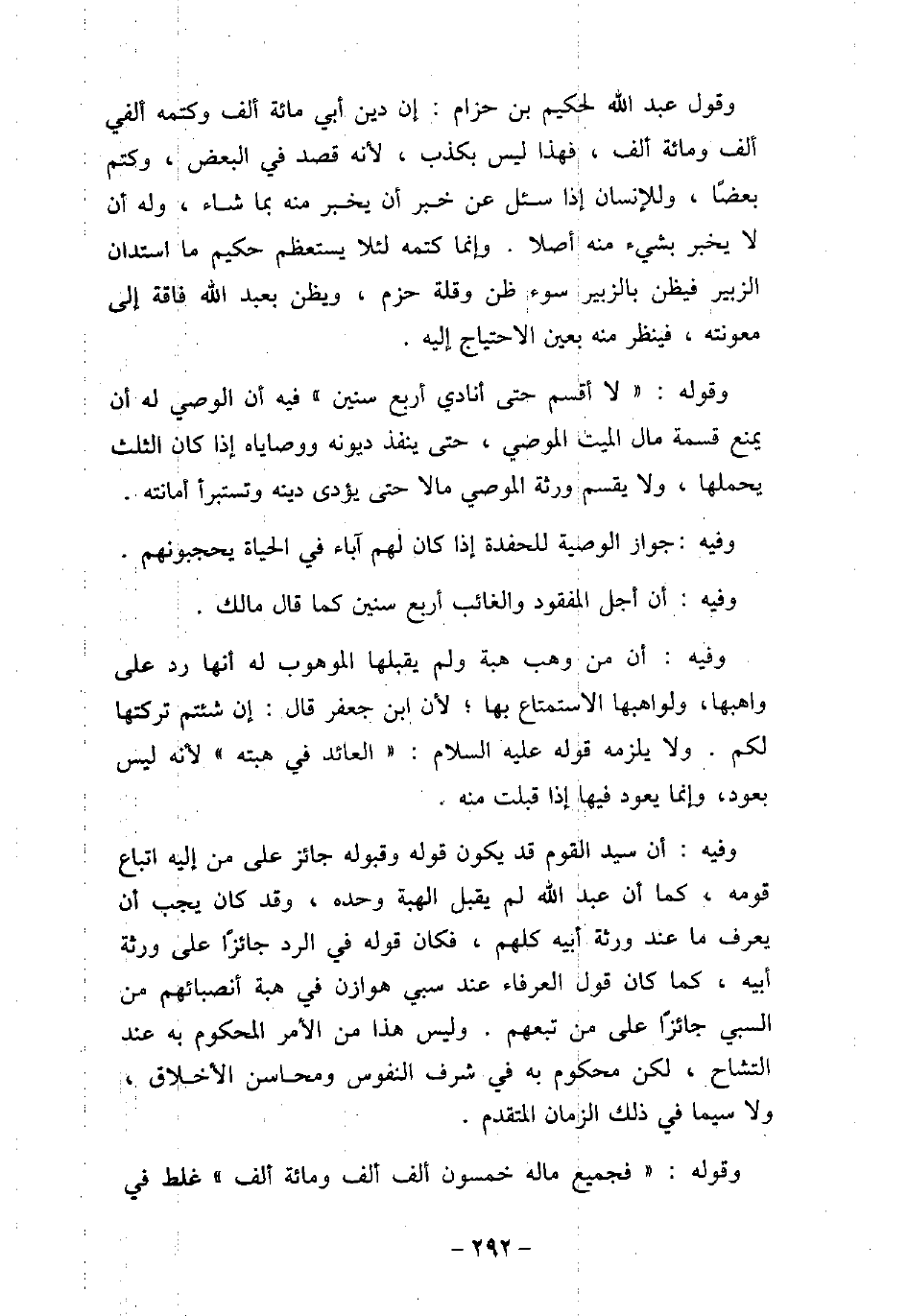 وقول عبد الله بن الحكيم بن جزام: إن دين أبى مائة ألف وكتمه ألفى ألف ومائة ألف، قهذا ليس بكذب، لأنه قصد فى البعض، وكتم بعضًا، وللإنسان إذا شئل عن خبر أن يخبر منه بما شاء، وله أن لا يخبر بشىء منه أصلا. وإنما كتمه لئلا يستعظم حكيم ما استدان الزبير، فيظن بالزبير سوء ظن وقلة حزم، ويظن بعبد الله فاقة إلى معونته، فينظر منه بعين الاحتياج إليه. وقوله: (لا أقسم حتى أنادى أربع سنين) ، فيه: أن الوصى له أن يمنع قسمة مال الميت الموصى، حتى ينفذ ديونه ووصاياه إذا كان الثلث يحملها، ولا يقسم ورثة الموصى مالا حتى يؤدى دينه وتستبرأ أمانته. وفيه: جواز الوصية للحفدة إذا كان لهم آباء فى الحياة يحجبونهم. وفيه: أن أجل المفقود والغالب أربع سنين كما قال مالك. وفيه: أن من وهب هبة ولم يثبلها الموهوب له أنها رد على واهبها، ولواهبها الاستمتاع بها؛ لأن ابن جعفر قال: إن شئتم تركتها لكم. ولا يلزمه قوله (صلى الله عليه وسلم) : (العائد فى هبته) لأنه ليس يعود، وإنما يعود فيها إذا قبلت منه. وفيه: أن سيد القوم قد يكون قوله وثبوله جائز على من إليه اتباع قومه، كما أن عبد الله لم يقبل الهبة وحده، وقد كان يجب أن يعرف ما عند ورثة أبيه كلهم، فكان قوله فى الرد جائزًا على ورثة أبيه، كما كان قول العرفاء عند سبى هوازن، فى هبة أنصبائهم من السبى جائزًا على من تبعهم. وليس هذا من الأمر المحكوم به فى شرف النفوس ومحاسن الأخلاق، ولا سيما فى ذلك الزمان المتقدم. وقوله: (فجميع ماله خمسون ألف ألف ومائة ألف، غلط فى