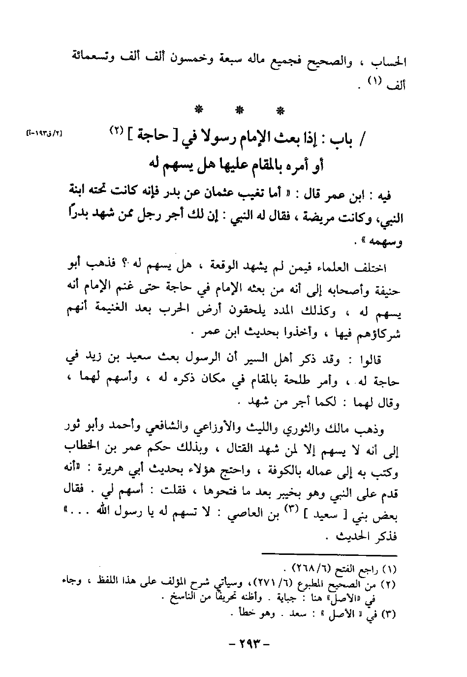 - باب إِذَا بَعَثَ الإمَامُ رَسُولا فِي حَاجَةٍ أَوْ أَمَرَهُ بِالْمُقَامِ هَلْ يُسْهَمُ لَهُ