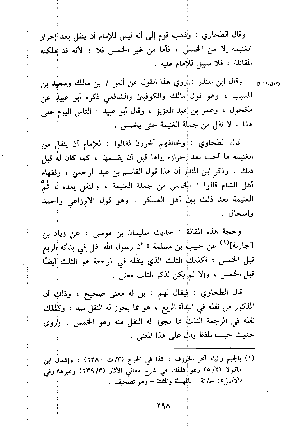 وقال الطحاوى: وذهب قوم إلى أنه ليس للإمام أن ينفل بعد إحراز الغنيمة إلا من الخمس، فأما من غير الخمس فلا؛ لأنه قد ملكته المقاتلة، فلا سبيل للإمام عليه. وقال ابن المنذر: روى هذا القول عن أنس بن مالك وسعيد بن المسيب، وهو قول مالك والكوفيين والشافعى ذكره أبو عبيد عن مكحول، وعمر بن عبد العزيز، وقال أبو عبيد: الناس اليوم على هذا، لا نفل من جملة الغنيمة حتى يخمس. قال الطحاوى: وخالفهم آخرون فقالوا: للإمام أن ينفل من الغنيمة ما أحب بعد إحرازه إياها قبل أن يقسمها، كما كان له قبل ذلك. وذكر ابن المنذر أن هذا قول القاسم بن عبد الرحمن، وفقهاء أهل الشام قالوا: الخمس من جملة الغنيمة، والنفل بعده، ثم الغنيمة بعد ذلك بين أهل العسكر. وهو قول الأوزاعى وأحمد وإسحاق. وحجة هذا المقالة: حديث سليمان بن موسى، عن زياد بن جارية، عن حبيب بن مسلمة (أن رسول الله نفل فى بدأته الربع قبل الخمس) فكذلك الثلث الذى ينفله فى الرجعة هو الثلث أيضًا قبل الخمس، وإلا لم يكن لذكر الثلث معنى. قال الطحاوى: فيقال لهم: بل له معنى صحيح، وذلك أن المذكور من نفله فى البدأة الربع، هو مما يجوز له النفل منه، وكذلك نفله فى الرجعة الثلث مما يجوز له النفل منه وهو الخمس. وروى حديث حبيب بلفظ يدل على هذا المعنى.