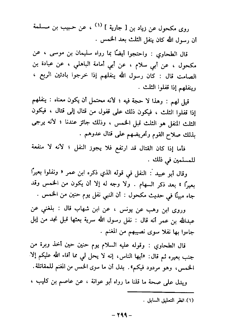 روى مكحول عن زياد بن جارية، عن حبيب بن مسلمة أن رسول الله كان ينفل الثلث بعد الخمس. قال الطحاوى: واحتجوا أيضًا بما رواه سليمان بن موسى، عن مكحول، عن أبى سلام، عن أبى أمامة الباهلى، عن عبادة بن الصامت قال: كان رسول الله ينفلهم إذا خرجوا بادئين الربع، وينفلهم إذا قفلوا الثلث. قيل لهم: وهذا لا حجة فيه؛ لأنه محتمل أن يكون معناه: ينفلهم إذا قفلوا الثلث، فيكون ذلك على قفول من قتال إلى قتال، فيكون الثلث المنفل هو الثلث قبل الخمس، وذلك جائز عندنا؛ لأنه يرجى بذلك صلاح القوم وتحريضهم على قتال عدوهم. فأما إذا كان القتال قد ارتفع فلا يجوز النفل؛ لأنه لامنفعة للمسلمين فى ذلك. وقال أبو عبيد: النفل فى قوله الذى ذكره ابن عمر (ونفلوا بعيرًا بعيرًا) بعد ذكر السهام. ولا وجه له إلا أن يكون من الخمس وقد جاء مبينًا فى حديث مكحول: أن النبى نفل يوم حنين من الخمس. وروى ابن وهب عن يونس عن ابن شهاب قال: بلغنى عن عبد الله بن عمر أنه قال: نفل رسول الله سرية بعثها قبل نجد من إبل جاءوا بها نفلا سوى نصيبهم من المغنم. قال الطحاوى: وقوله (صلى الله عليه وسلم) يوم حنين حين أخذ وبرة من جنب بعيره ثم قال: (أيها الناس، إنه لا يحل لى مما أفاء الله عليكم إلا الخمس، وهو مردود فيكم) . يدل أن ما سوى الخمس من المغنم للمقاتلة. ويدل على صحة ما قلنا ما رواه أبو عوانة، عن عاصم بن كليب،