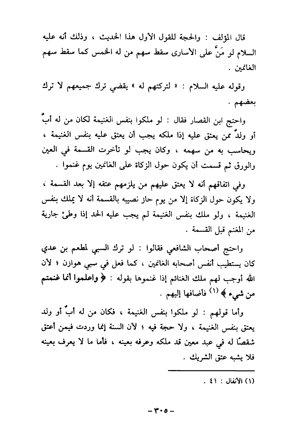 قال المؤلف: والحجة للقول الأول هذا الحديث، وذلك أنه (صلى الله عليه وسلم) لو من على الأسارى سقط سهم من له الخمس كما سقط سهم الغانمين. وقوله (صلى الله عليه وسلم) : (لتركتهم به) يقضى ترك جميعهم لا ترك بعضهم. واحتج ابن القصار فقال: لو ملكوا بنفس الغنيمة لكان من له أب أو ولد ممن يعتق عليه إذا ملكه يجب أن يعتق عليه بنفس الغنيمة، ويحاسب به من سهمه، وكان يجب لو تأخرت القسمة فى العين والورق ثم قسمت أن يكون حول الزكاة على الغانمين يوم غنموا. وفى اتفاقهم أنه لا يعتق عليهم من يلزمهم عتقه إلا بعد القسمة، ولا يكون حول الزكاة إلا من يوم حاز نصيبه بالقسمة أنه لا يملك بنفس الغنيمة، ولو ملك بنفس الغنيمة لم يجب عليه الحد إذا وطىء جارية من المغنم قبل القسمة. واحتج أصحاب الشافعى فقالوا: لو ترك السبى لمطعم بن عدى كان يستطيب أنفس أصحابه الغانمين، كما فعل فى سبى هوازن؛ لأن الله أوجب لهم ملك الغنائم إذا غنموها بقوله: (واعلموا أنما غنمتم من شىء (فأضافهم إليهم. وأما قولهم: لو ملكوا بنفس الغنيمة، فكان من له أب أو ولد يعتق بنفس الغنيمة، ولا حجة فيه؛ لأن السنة إنما وردت فيمن أعتق شقصًا له فى عبد معين قد ملكه وعرفه بعينه، فأما ما لا يعرف بعينه فلا يشبه عتق الشريك.