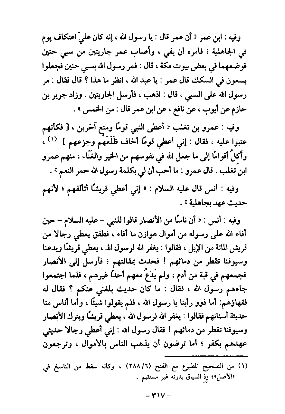 52 / وفيه: ابْن عُمَرَ، أَنَّ عُمَرَ، قَالَ: يَا رَسُولَ اللَّهِ، إِنَّهُ كَانَ عَلَىَّ اعْتِكَافُ يَوْمٍ فِى الْجَاهِلِيَّةِ، فَأَمَرَهُ أَنْ يَفِىَ بِهِ، وَأَصَابَ عُمَرُ جَارِيَتَيْنِ مِنْ سَبْىِ حُنَيْنٍ، فَوَضَعَهُمَا فِى بَعْضِ بُيُوتِ مَكَّةَ، قَالَ: فَمَرَّ رَسُولُ اللَّهِ (صلى الله عليه وسلم) عَلَى سَبْىِ حُنَيْنٍ، فَجَعَلُوا يَسْعَوْنَ فِى السِّكَكِ، قَالَ عُمَرُ: يَا عَبْدَاللَّهِ، انْظُرْ مَا هَذَا؟ قَالَ: فَقَالَ: مَرَّ رَسُولُ اللَّهِ (صلى الله عليه وسلم) عَلَى السَّبْىِ، قَالَ: اذْهَبْ فَأَرْسِلِ الْجَارِيَتَيْنِ. وَزَادَ جَرِيرُ بْنُ حَازِمٍ، عَنْ أَيُّوبَ، عَنْ نَافِعٍ، عَنِ ابْنِ عُمَرَ، قَالَ: مِنَ الْخُمُسِ. 1953 / وفيه: عَمْرُو بْنُ تَغْلِبَ، أَعْطَى النَّبِىّ (صلى الله عليه وسلم) قَوْمًا، وَمَنَعَ آخَرِينَ، فَكَأَنَّهُمْ عَتَبُوا عَلَيْهِ، فَقَالَ: (إِنِّى أُعْطِى قَوْمًا أَخَافُ ظَلَعَهُمْ وَجَزَعَهُمْ، وَأَكِلُ أَقْوَامًا إِلَى مَا جَعَلَ اللَّهُ فِى نُفُوسِهِمْ مِنَ الْخَيْرِ وَالْغِنَى، مِنْهُمْ عَمْرُو بْنُ تَغْلِبَ) ، فَقَالَ عَمْرُو: مَا أُحِبُّ أَنَّ لِى بِكَلِمَةِ رَسُولِ اللَّهِ (صلى الله عليه وسلم) حُمْرَ النَّعَمِ. 1954 / وفيه: أَنَس، قَالَ (صلى الله عليه وسلم) : (إِنِّى أُعْطِى قُرَيْشًا أَتَأَلَّفُهُمْ؛ لأنَّهُمْ حَدِيثُ عَهْدٍ بِجَاهِلِيَّةٍ) . 1955 / وفيه: أَنَسُ، أَنَّ نَاسًا مِنَ الأنْصَارِ قَالُوا لِلْنَّبِىّ، (صلى الله عليه وسلم) حِينَ أَفَاءَ اللَّهُ عَلَى رَسُولِهِ (صلى الله عليه وسلم) مِنْ أَمْوَالِ هَوَازِنَ: مَا أَفَاءَ، فَطَفِقَ يُعْطِى رِجَالا مِنْ قُرَيْشٍ الْمِائَةَ مِنَ الإبِلِ، فَقَالُوا: يَغْفِرُ اللَّهُ لِرَسُولِ اللَّهِ (صلى الله عليه وسلم) يُعْطِى قُرَيْشًا، وَيَدَعُنَا وَسُيُوفُنَا تَقْطُرُ مِنْ دِمَائِهِمْ، فَحُدِّثَ بِمَقَالَتِهِمْ، فَأَرْسَلَ إِلَى الأنْصَارِ، فَجَمَعَهُمْ فِى قُبَّةٍ مِنْ أَدَمٍ، وَلَمْ يَدْعُ مَعَهُمْ أَحَدًا غَيْرَهُمْ، فَلَمَّا اجْتَمَعُوا، جَاءَهُمْ رَسُولُ اللَّهِ (صلى الله عليه وسلم) ، فَقَالَ: (مَا كَانَ حَدِيثٌ بَلَغَنِى عَنْكُمْ) ؟ فَقَالَ لَهُ فُقَهَاؤُهُمْ: أَمَّا ذَوُو آَرَأَيَنَا يَا رَسُولَ اللَّهِ، فَلَمْ يَقُولُوا شَيْئًا، وَأَمَّا أُنَاسٌ مِنَّا حَدِيثَةٌ أَسْنَانُهُمْ، فَقَالُوا: يَغْفِرُ اللَّهُ لِرَسُولِ اللَّهِ (صلى الله عليه وسلم) يُعْطِى قُرَيْشًا، وَيَتْرُكُ الأنْصَارَ وَسُيُوفُنَا تَقْطُرُ مِنْ دِمَائِهِمْ، فَقَالَ رَسُولُ اللَّهِ (صلى الله عليه وسلم) : (إِنِّى أُعْطِى رِجَالا حَدِيثِى عَهْدُهُمْ بِكُفْرٍ، أَمَا تَرْضَوْنَ أَنْ يَذْهَبَ النَّاسُ بِالأمْوَالِ، وَتَرْجِعُون