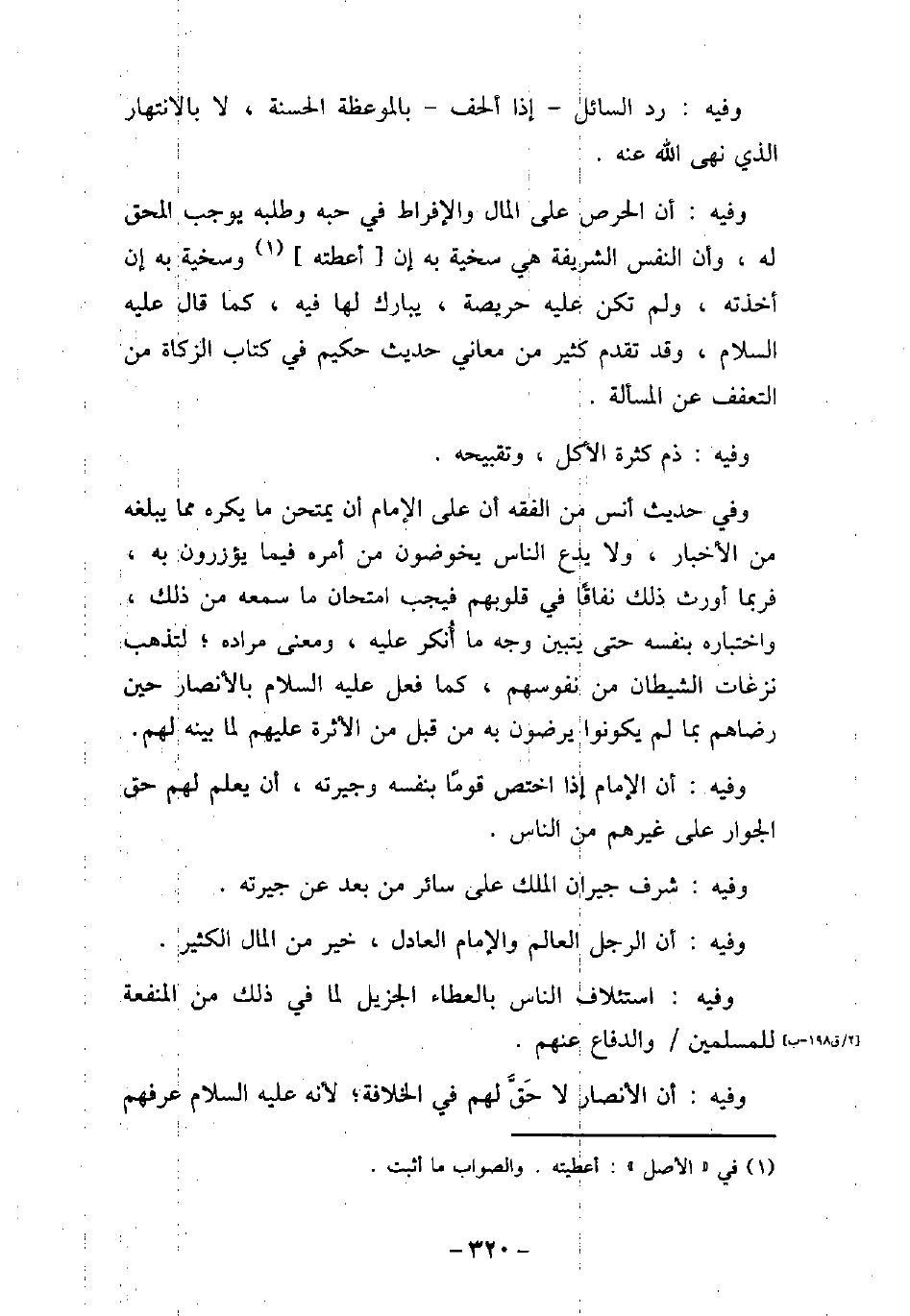 وفيه: رد السائل إذا ألحف بالموعظة الحسنة، لا بالانتهار الذى نهى الله عنه. وفيه: أن الحرص على المال والإفراط فى حبه وطلبه يوجب المحق له، وأن النفس الشريفة هى سخية به إن أعطته وسخية به إن أخذته، ولم تكن عليه حريصة، يبارك لها فيه، كما قال (صلى الله عليه وسلم) ، وقد تقدم كثير من معانى حديث حكيم فى كتاب الزكاة من التعفف عن المسألة. وفيه: ذم كثرة الأكل، وتقبيحه. وفى حديث أنس من الفقه أن على الإمام أن يمتحن ما يكره مما يبلغه من الأخبار، ولا يدع الناس يخوضون من أمره فيما يؤزرون به، فربما أورث ذلك نفاقًا فى قلوبهم فيجب امتحان ما سمعه من ذلك، واختباره بنفسه حتى يتبين وجه ما أنكر عليه، ومعنى مراده؛ لتذهب نزغات الشيطان من نفوسهم، كما فعل (صلى الله عليه وسلم) بالأنصار حين رضاهم بما لم يكونوا يرضون به من قبل من الأثرة عليهم لما بينه لهم. وفيه: أن الإمام إذا اختص قومًا بنفسه وجيرته، أن يعلم لهم حق الجوار على غيرهم من الناس. وفيه: شرف جيران الملك على سائر من بعد عن جيرته. وفيه: أن الرجل العالم والإمام العادل، خير من المال الكثير. وفيه: استئلاف الناس بالعطاء الجزيل لما فى ذلك من المنفعة للمسلمين والدفاع عنهم. وفيه: أن الأنصار لا حق لهم فى الخلافة؛ لأنه (صلى الله عليه وسلم) عرفهم