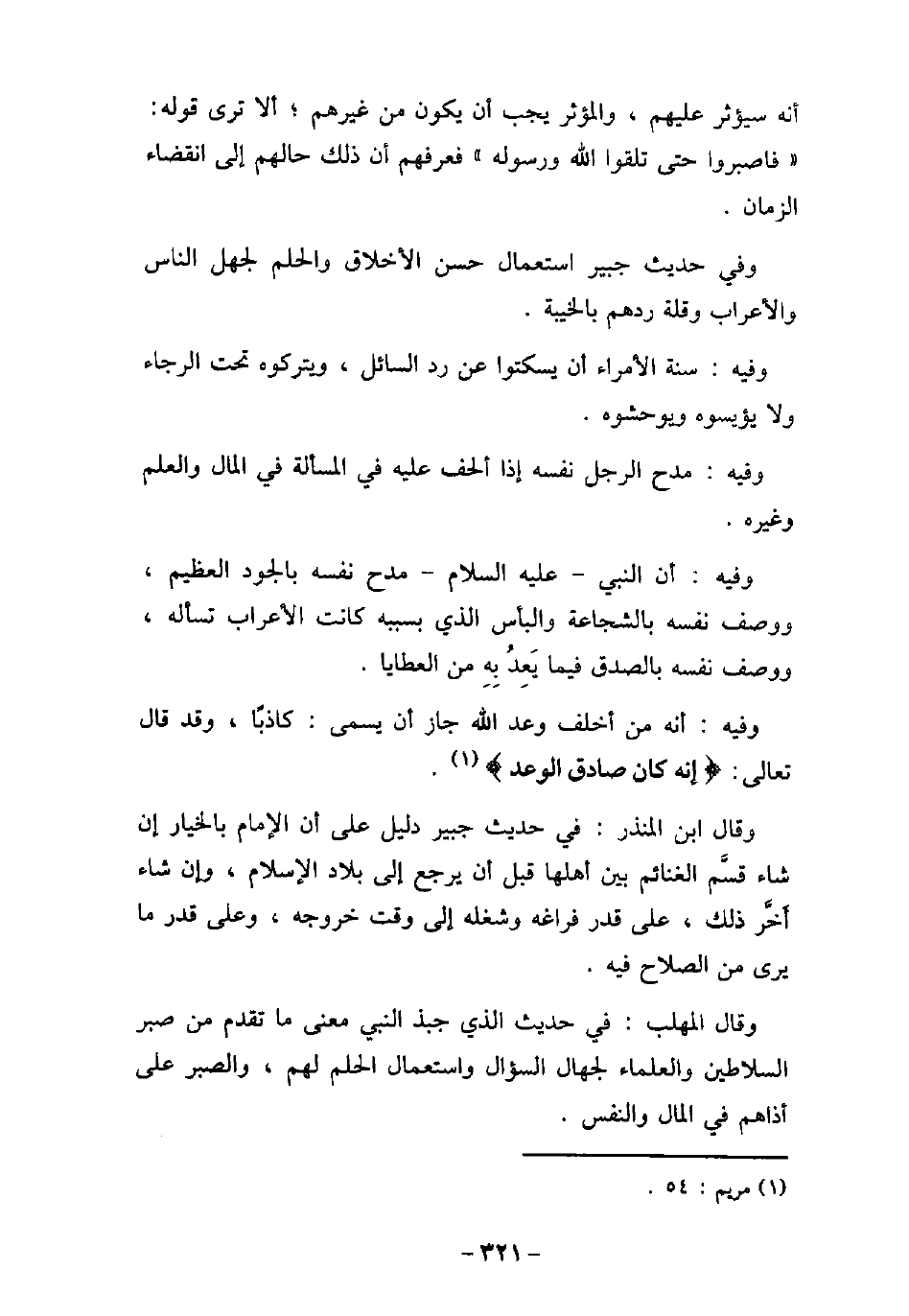 أنه سيؤثر عليهم، والمؤثر يجب أن يكون من غيرهم؛ ألا ترى قوله: (فاصبروا حتى تلقوا الله ورسوله) فعرفهم أن ذلك حالهم إلى انقضاء الزمان. وفى حديث جبير استعمال حسن الأخلاق والحلم لجهل الناس والأعراب وقلة ردهم بالخيبة. وفيه: سنة الأمراء أن يسكنوا عن رد السائل، ويتركوه تحت الرجاء ولا يؤيسوه ويوحشوه. وفيه: مدح الرجل نفسه إذا ألحف عليه فى المسألة فى المال والعلم وغيره. وفيه: أن النبى (صلى الله عليه وسلم) مدح نفسه بالجود العظيم، ووصف نفسه بالشجاعة والبأس الذى بسببه كانت الأعراب تسأله، ووصف نفسه بالصدق فيما يعد به من العطايا. وفيه: أنه من أخلف وعد الله جاز أن يسمى: كاذبًا، وقد قال تعالى: (إنه كان صادق الوعد (. وقال ابن المنذر: فى حديث جبير دليل على أن الإمام بالخيار إن شاء قسم الغنائم بين أهلها قبل أن يرجع إلى بلاد الإسلام، وإن شاء أخر ذلك، على قدر فراغه وشغله إلى وقت خروجه، وعلى قدر ما يرى من الصلاح فيه. وقال المهلب: فى حديث الذى جبذ النبى معنى ما تقدم من صبر السلاطين والعلماء لجهال السؤال واستعمال الحلم لهم، والصبر على أذاهم فى المال والنفس.