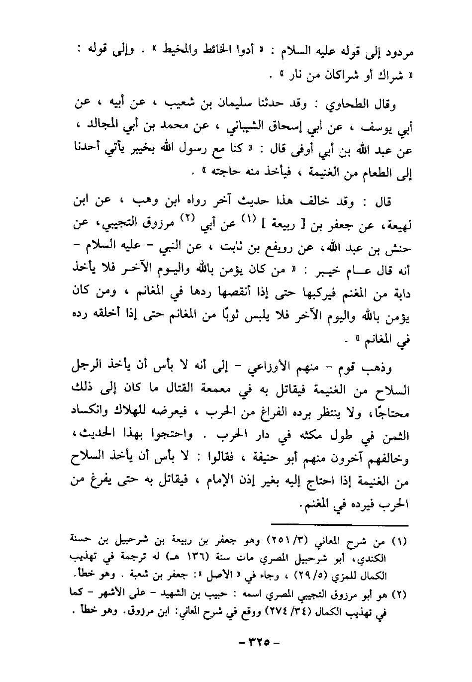 مردود إلى قوله (صلى الله عليه وسلم) : (أدوا الخائط والمخيط) . وإلى قوله: (شراك أو شراكان من نار) . وقال الطحاوى: وقد حدثنا سليمان بن شعيب، عن أبيه، عن أبى يوسف، عن أبى إسحاق الشيبانى، عن محمد بن أبى المجالد، عن عبد الله بن أبى أوفى قال: (كنا مع رسول الله بخيبر يأتى أحدنا إلى الطعام من الغنيمة، فيأخذ منه حاجته) . قال: وقد خالف هذا حديث آخر رواه ابن وهب، عن ابن لهيعة، عن جعفر بن ربيعة، عن أبى مرزوق التجيبى، عن حنش بن عبد الله، عن رويفع بن ثابت، عن النبى (صلى الله عليه وسلم) أنه قال عام خيبر: (من كان يؤمن بالله واليوم الآخر فلا يأخذ دابة من المغنم فيركبها حتى إذا أنقصها ردها فى المغانم، ومن كان يؤمن بالله واليوم الآخر فلا يليس ثوبًا من المغانم حتى إذا أخلقه رده فى المغانم) . وذهب قوم منهم الأوزاعى إلى أنه لا بأس أن يأخذ الرجل السلاح من الغنيمة فيقاتل به فى معمعة القتال ما كان إلى ذلك محتاجًا، ولا ينتظر برده الفراغ من الحرب، فيعرضه للهلاك وانكساد الثمن فى طول مكثه فى دار الحرب. واحتجوا بهذا الحديث، وخالفهم آخرون منهم أبو حنيفة، فقالوا: لا بأس أن يأخذ السلاح من الغنيمة إذا احتاج إليه بغير إذن الإمام، فيقاتل به حتى يفرغ من الحرب فيرده فى المغنم.