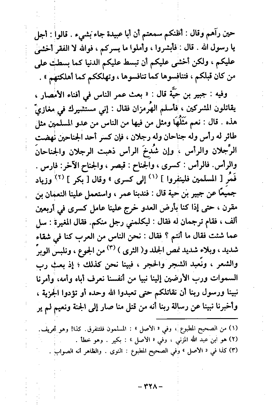 حِينَ رَآهُمْ، وَقَالَ: (أَظُنُّكُمْ قَدْ سَمِعْتُمْ أَنَّ أَبَا عُبَيْدَةَ قَدْ جَاءَ بِشَىْءٍ) ، قَالُوا: أَجَلْ، يَا رَسُولَ اللَّهِ، قَالَ: (فَأَبْشِرُوا وَأَمِّلُوا مَا يَسُرُّكُمْ، فَوَاللَّهِ لا الْفَقْرَ أَخْشَى عَلَيْكُمْ، وَلَكِنْ أَخَشَى عَلَيْكُمْ أَنْ تُبْسَطَ عَلَيْكُمُ الدُّنْيَا كَمَا بُسِطَتْ عَلَى مَنْ كَانَ قَبْلَكُمْ، فَتَنَافَسُوهَا كَمَا تَنَافَسُوهَا، وَتُهْلِكَكُمْ كَمَا أَهْلَكَتْهُمْ) . 196 / وفيه: جُبَيْرِ بْنِ حَيَّةَ، قَالَ: بَعَثَ عُمَرُ النَّاسَ فِى أَفْنَاءِ الأمْصَارِ يُقَاتِلُونَ الْمُشْرِكِينَ، فَأَسْلَمَ الْهُرْمُزَانُ، فَقَالَ: إِنِّى مُسْتَشِيرُكَ فِى مَغَازِىَّ هَذِهِ، قَالَ: نَعَمْ، مَثَلُهَا وَمَثَلُ مَنْ فِيهَا مِنَ النَّاسِ مِنْ عَدُوِّ الْمُسْلِمِينَ مَثَلُ طَائِرٍ لَهُ رَأْسٌ، وَلَهُ جَنَاحَانِ، وَلَهُ رِجْلانِ، فَإِنْ كُسِرَ أَحَدُ الْجَنَاحَيْنِ نَهَضَتِ الرِّجْلانِ بِجَنَاحٍ وَالرَّأْسُ، فَإِنْ كُسِرَ الْجَنَاحُ الآخَرُ نَهَضَتِ الرِّجْلانِ وَالرَّأْسُ، وَإِنْ شُدِخَ الرَّأْسُ، ذَهَبَتِ الرِّجْلانِ وَالْجَنَاحَانِ وَالرَّأْسُ، فَالرَّأْسُ كِسْرَى، وَالْجَنَاحُ قَيْصَرُ، وَالْجَنَاحُ الآخَرُ فَارِسُ، فَمُرِ الْمُسْلِمِينَ، فَلْيَنْفِرُوا إِلَى كِسْرَى. وَقَالَ بَكْرٌ وَزِيَادٌ جَمِيعًا: عَنْ جُبَيْرِ بْنِ حَيَّةَ قَالَ: فَنَدَبَنَا عُمَرُ، وَاسْتَعْمَلَ عَلَيْنَا النُّعْمَانَ بْنَ مُقَرِّنٍ، حَتَّى إِذَا كُنَّا بِأَرْضِ الْعَدُوِّ، وَخَرَجَ عَلَيْنَا عَامِلُ كِسْرَى فِى أَرْبَعِينَ أَلْفًا، فَقَامَ تَرْجُمَانٌ لَهُ فَقَالَ: لِيُكَلِّمْنِى رَجُلٌ مِنْكُمْ، فَقَالَ الْمُغِيرَةُ: سَلْ عَمَّا شِئْتَ، قَالَ: مَا أَنْتُمْ؟ قَالَ: نَحْنُ أُنَاسٌ مِنَ الْعَرَبِ، كُنَّا فِى شَقَاءٍ شَدِيدٍ وَبَلاءٍ شَدِيدٍ نَمَصُّ الْجِلْدَ وَالنَّوَى مِنَ الْجُوعِ، وَنَلْبَسُ الْوَبَرَ وَالشَّعَرَ، وَنَعْبُدُ الشَّجَرَ وَالْحَجَرَ، فَبَيْنَا نَحْنُ كَذَلِكَ إِذْ بَعَثَ رَبُّ السَّمَوَاتِ وَرَبُّ الأرَضِينَ، إِلَيْنَا نَبِيًّا مِنْ أَنْفُسِنَا، نَعْرِفُ أَبَاهُ وَأُمَّهُ، فَأَمَرَنَا نَبِيُّنَا ورَسُولُ رَبِّنَا (صلى الله عليه وسلم) أَنْ نُقَاتِلَكُمْ حَتَّى تَعْبُدُوا اللَّهَ وَحْدَهُ أَوْ تُؤَدُّوا الْجِزْيَةَ، وَأَخْبَرَنَا نَبِيُّنَا (صلى الله عليه وسلم) عَنْ رِسَالَةِ رَبِّنَا أَنَّهُ مَنْ قُتِلَ مِنَّا صَارَ إِلَى الْجَنَّةِ وَنَعِيمٍ، لَمْ يَرَ مِثْلَهُ