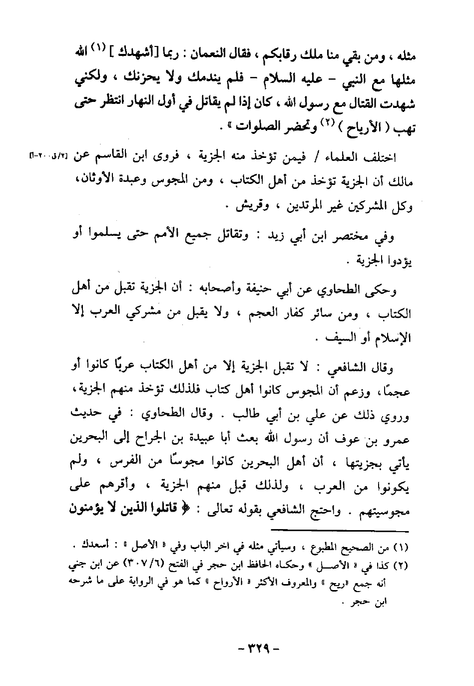 قَطُّ، وَمَنْ بَقِىَ مِنَّا مَلَكَ رِقَابَكُمْ، فَقَالَ النُّعْمَانُ: رُبَّمَا أَشْهَدَكَ اللَّهُ مِثْلَهَا مَعَ النَّبِىِّ (صلى الله عليه وسلم) ، فَلَمْ يُنَدِّمْكَ، وَلَمْ يُخْزِكَ، وَلَكِنِّى شَهِدْتُ الْقِتَالَ مَعَ رَسُولِ اللَّهِ (صلى الله عليه وسلم) كَانَ إِذَا لَمْ يُقَاتِلْ فِى أَوَّلِ النَّهَارِ انْتَظَرَ حَتَّى تَهُبَّ الأرْوَاحُ، وَتَحْضُرَ الصَّلَوَاتُ. اختلف العلماء، فيمن تؤخذ منه الجزية، فروى ابن القاسم عن مالك أن الجزية تؤخذ من أهل الكتاب، ومن المجوس وعبدة الأوثان، وكل المشركين غير المرتدين، وقريش. وفى مختصر ابن أبى زيد: وتقاتل جميع الأمم حتى يسلموا أو يؤدوا الجزية. وحكى الطحاوى عن أبى حنيفة وأصحابه: أن الجزية تقبل من أهل الكتاب، ومن سائر كفار العجم، ولا يقبل من مشركى العرب إلا الإسلام أو السيف. وقال الشافعى: لا تقبل الجزية إلا من أهل الكتاب عربًا كانوا أو عجمًا، وزعم أن المجوس كانوا أهل كتاب فلذلك تؤخذ منهم الجزية، وروى ذلك عن على بن أبى طالب. وقال الطحاوى: فى حديث عمرو بن عوف أن رسول الله بعث أبا عبيدة بن الجراح إلى البحرين يأتى بجزيتها، أن أهل البحرين كانوا مجوسًا من الفرس، ولم يكونوا من العرب، ولذلك قبل منهم الجزية، وأقرهم على مجوسيتهم. واحتج الشافعى بقوله تعالى: (قاتلوا الذين لا يؤمنون