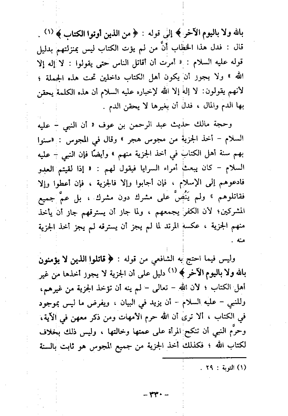 بالله ولا باليوم الآخر (إلى قوله: (من الذين أوتوا الكتاب (. قال: فدل هذا الخطاب أن من لم يؤت الكتاب ليس بمنزلتهم بدليل قوله (صلى الله عليه وسلم) : (أمرت أن أقاتل الناس حتى يقولوا: لا إله إلا الله) ولا يجوز أن يكون أهل الكتاب داخلين تحت هذه الجملة؛ لأنهم يقولون: لا إله إلا الله لإخباره (صلى الله عليه وسلم) أن هذه الكلمة يحقن بها الدم والمال، فدل أن بغيرها لا يحقن الدم. وحجة مالك حديث عبد الرحمن بن عوف (أن النبى (صلى الله عليه وسلم) أخذ الجزية من مجوس هجر) وقال فى المجوس: (سنوا بهم سنة أهل الكتاب فى أخذ الجزية منهم) وأيضًا فإن النبى (صلى الله عليه وسلم) كان يبعث أمراء السرايا فيقول لهم: (إذا لقيتم العدو فادعوهم إلى الإسلام، فإن أجابوا وإلا فالجزية، فإن أعطوا وإلا فقاتلوهم) ولم ينص على مشرك دون مشرك، بل عم جميع المشركين؛ لأن الكفر يجمعهم، ولما جاز أن يسترقهم جاز أن يأخذ منهم الجزية، عكسه المرتد لما لم يجز أن يسترقه لم يجز أخذ الجزية منه. وليس فيما احتج به الشافعى من قوله: (قاتلوا الذين لا يؤمنون بالله ولا باليوم الآخر (دليل على أن الجزية لا يجوز أخذها من غير أهل الكتاب؛ لأن الله تعالى لم ينه أن تؤخذ الجزية من غيرهم، وللنبى (صلى الله عليه وسلم) أن يزيد فى البيان، ويفرض ما ليس بموجود فى الكتاب، ألا ترى أن الله حرم الأمهات ومن ذكر معهن فى الآية، وحرم النبى أن تنكح المرأة على عمتها وخالتها، وليس ذلك بخلاف لكتاب الله؛ فكذلك أخذ الجزية من جميع المجوس هو ثابت بالسنة