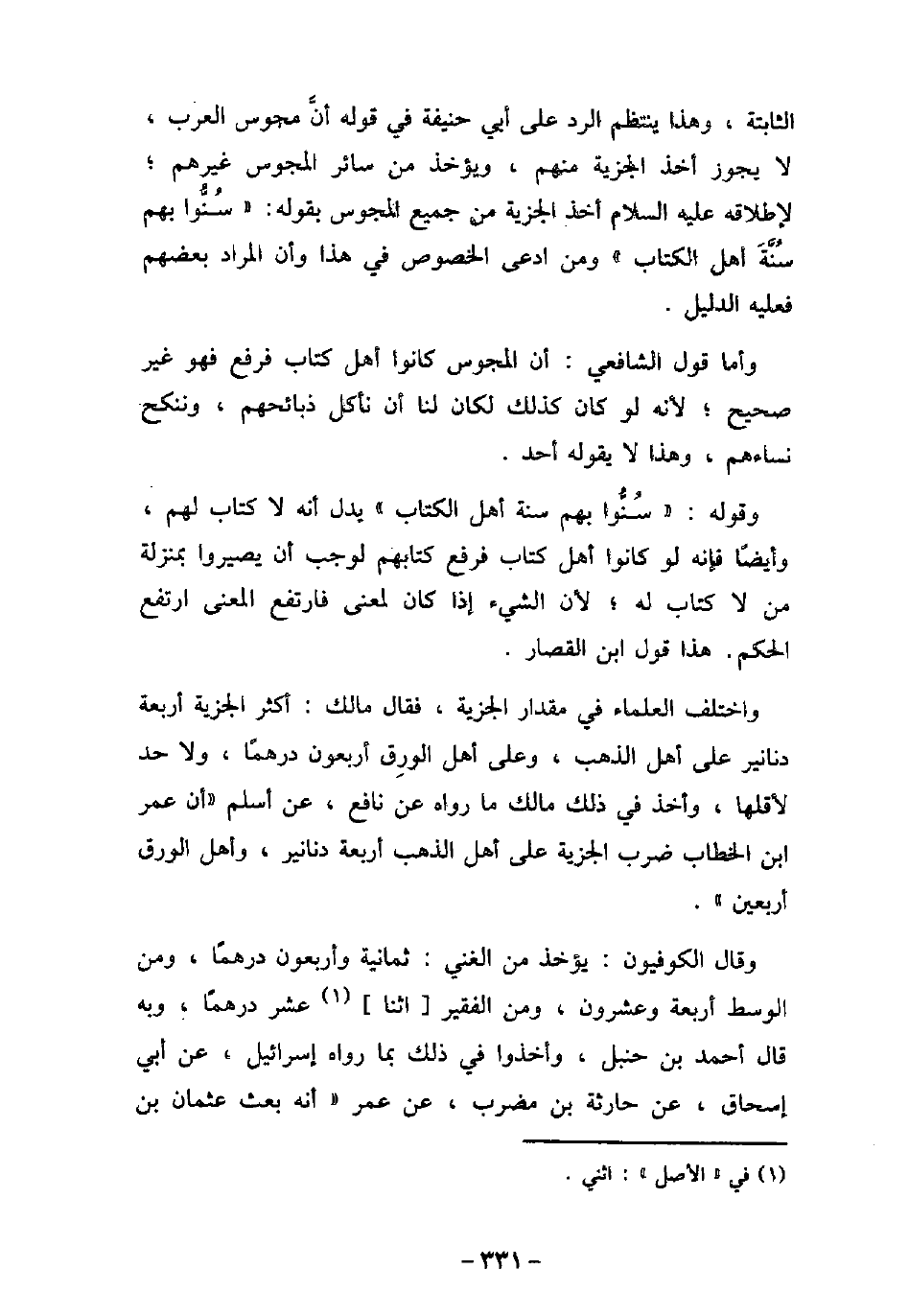 الثابتة، وهذا ينتظم الرد على أبى حنيفة فى قوله أن مجوس العرب، لا يجوز أخذ الجزية منهم، ويؤخذ من سائر المجوس غيرهم؛ لإطلاقه (صلى الله عليه وسلم) أخذ الجزية من جميع المجوس بقوله: (سنوا بهم سنة أهل الكتاب) ومن ادعى الخصوص فى هذا وأن المراد بعضهم فعليه الدليل. وأما قول الشافعى: أن المجوس كانوا أهل كتاب فرفع فهو غير صحيح؛ لأنه لو كان كذلك لكان لنا أن نأكل ذبائحهم، وننكح نساءهم، وهذا لا يقوله أحد. وقوله: (سنوا بهم سنة أهل الكتاب) يدل أنه لا كتاب لهم، وأيضًا فإنه لو كانوا أهل كتاب فرفع كتابهم لوجب أن يصيروا بمنزلة من لا كتاب له؛ لأن الشيء إذا كان لمعنى فارتفع المعنى ارتفع الحكم. هذا قول ابن القصار. واختلف العلماء فى مقدار الجزية، فقال مالك: أكثر الجزية أربعة دنانير على أهل الذهب، وعلى أهل الورق أربعون درهمًا، ولا حد لأقلها، وأخذ فى ذلك مالك ما رواه عن نافع، عن أسلم (أن عمر بن الخطاب ضرب الجزية على أهل الذهب أربعة دنانير، وأهل الورق أربعين) . وقال الكوفيون: يؤخذ من الغنى: ثمانية وأربعون درهمًا، ومن الوسط أربعة وعشرون، ومن الفقير اثنا عشر درهمًا، وبه قال أحمد بن حنبل، وأخذوا فى ذلك بما رواه إسرائيل، عن أبى إسحاق، عن حارثة بن مضرب، عن عمر (أنه بعث عثمان بن
