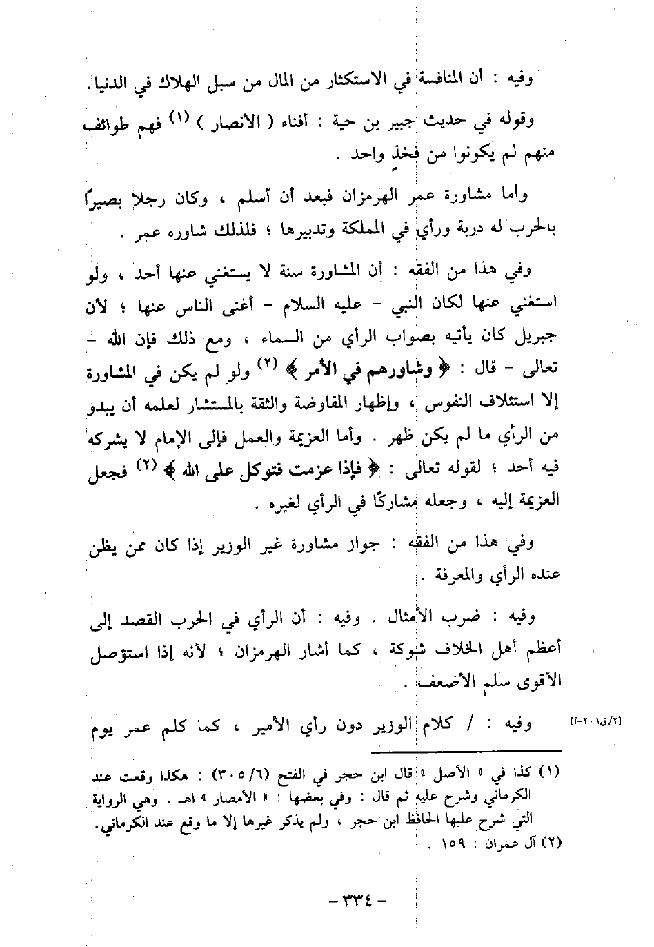 وفيه: أن المنافسة فى الاستكثار من المال من سبل الهلاك فى الدنيا. وقوله فى حديث جبير بن حية: أفناء الأنصار فهم طوائف منهم لم يكونوا من فخذ واحد. وأما مشاورة عمر الهرمزان فبعد أن أسلم، وكان رجلا بصيرًا بالحرب له دربة ورأى فى المملكة وتدبيرها؛ فلذلك شاوره عمر. وفى هذا من الفقه: أن المشاورة سنة لا يستغنى عنها أحد، ولو استغنى عنها لكان النبى (صلى الله عليه وسلم) أغنى الناس عنها؛ لأن جبريل كان يأتيه بصواب الرأى من السماء، ومع ذلك فإن الله تعالى قال: (وشاورهم فى الأمر (ولو لم يكن في المشاورة إلا استئلاف النفوس، وإظهار المفاوضة والثقة بالمستشار لعلمه أن يبدو من الرأى ما لم يكن ظهر. وأما العزيمة والعمل فإلى الإمام لا يشركه فيه أحد؛ لقوله تعالى: (فإذا عزمت فتوكل على الله (فجعل العزيمة إليه، وجعله مشاركًا فى الرأى لغيره. وفى هذا من الفقه: جواز مشاورة غير الوزير إذا كان ممن يظن عنده الرأى والمعرفة. وفيه: ضرب الأمثال. وفيه: أن الرأى فى الحرب القصد إلى أعظم أهل الخلاف شوكة، كما أشار الهرمزان؛ لأنه إذا استؤصل الأقوى سلم الأضعف. وفيه: كلام الوزير دون رأى الأمير، كما كلم عمر يوم