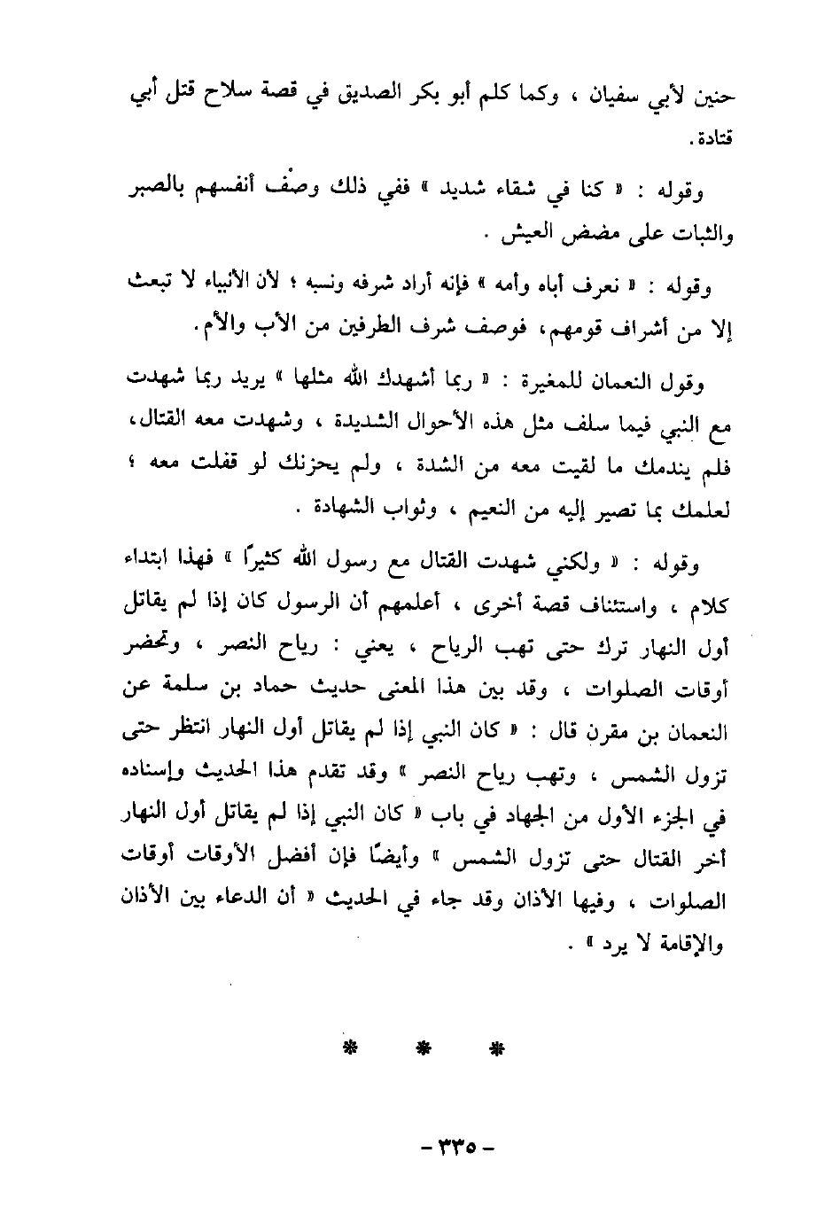 حنين لأبى سفيان، وكما كلم أبو بكر الصديق فى قصة سلاح قتل أبى قتادة. وقوله: (كنا فى شقاء شديد) ففى ذلك وصف أنفسهم بالصبر والثبات على مضض العيش. وقوله: (نعرف أباه وأمه) فإنه أراد شرفه ونسبه؛ لأن الأنبياء لا تبعث إلا من أشراف قومهم، فوصف شرف الطرفين من الأب والأم. وقول النعمان للمغيرة: (ربما أشهدك الله مثلها) يريد ربما شهدت مع النبى فيما سلف مثل هذه الأحوال الشديدة، وشهدت معه القتال، فلم يندمك ما لقيت معه من الشدة، ولم يحزنك لو قفلت معه؛ لعلمك بما تصير إليه من النعيم، وثواب الشهادة. وقوله: (ولكنى شهدت القتال مع رسول الله كثيرًا) فهذا ابتداء كلام، واستئناف قصة أخرى، أعلمهم أن الرسول كان إذا لم يقاتل أول النهار ترك حتى تهب الرياح، يعنى: رياح النصر، وتحضر أوقات الصلوات، وقد بين هذا المعنى حديث حماد بن سلمة عن النعمان بن مقرن قال: (كان النبى إذا لم يقاتل أول النهار انتظر حتى تزول الشمس، وتهب رياح النصر) وقد تقدم هذا الحديث وإسناده فى الجزء الأول من الجهاد فى باب (كان النبى إذا لم يقاتل أول النهار أخر القتال حتى تزول الشمس) ، وأيضًا فإن أفضل الأوقات أوقات الصلوات، وفيها الأذان وقد جاء فى الحديث (أن الدعاء بين الأذان والإقامة لا يرد) .