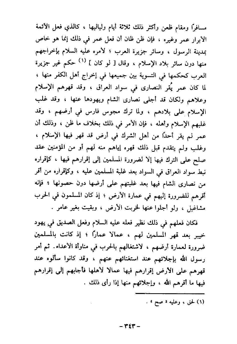 مسافرًا ومقام ظعن وأكثر ذلك ثلاثة أيام ولياليها، كالذى فعل الأئمة الأبرار عمر وغيره، فإن ظن ظان أن فعل عمر فى ذلك إنما هو خاص بمدينة الرسول، وسائر جزيرة العرب؛ لأمره (صلى الله عليه وسلم) بإخراجهم منها دون سائر بلاد الإسلام وقال: (لو كان) حكم غير جزيرة العرب كحكمها فى التسوية بين جميعها فى إخراج أهل الكفر منها، لما كان عمر يقر النصارى فى سواد العراق وقد قهرهم الإسلام وعلاهم ولكان قد أجلى نصارى الشام ويهودها عنه، وقد غلب الإسلام على بلادهم، ولما ترك مجوس فارس فى أرضهم، وقد غلبهم الإسلام وأهله، فإن الأمر فى ذلك بخلاف ما ظن، وذلك أن عمر لم يقر أحدًا من أهل الشرك فى أرض قد قهر فيها الإسلام، وغلب ولم يتقدم قبل ذلك قهره إياهم منه لهم أو من المؤمنين عقد صلح على الترك فيها إلا لضرورة المسلمين إلى إقرارهم فيها، كإقراره نبط سواد العرق فى السواد بعد غلبة المسلمين عليه، وكإقراره من أقر من نصارى الشام فيها بعد غلبتهم على أرضها دون حصونها؛ فإنه أقرهم للضرورة إليهم فى عمارة الأرض؛ إذ كان المسلمون فى الحرب مشاغيل، ولو أجلوا عنها لخربت الأرض، وبقيت بغير عامر. فكان فعلهم فى ذلك نظير فعله (صلى الله عليه وسلم) وفعل الصديق فى يهود خيبر بعد قهر المسلمين لهم، عمالا عمارا؛ إذ كانت بالمسلمين ضرورة لعمارة أرضهم، لاشتغالهم بالحرب فى مناوأة الأعداء. ثم أمر رسول الله بإجلائهم عند استغنائهم عنهم، وقد كانوا سألوه عند قهرهم على الأرض إقرارهم فيها عمالا لأهلها فأجابهم إلى إقرارهم فها ما أقرهم الله، وإجلائهم منها إذا رأى ذلك.