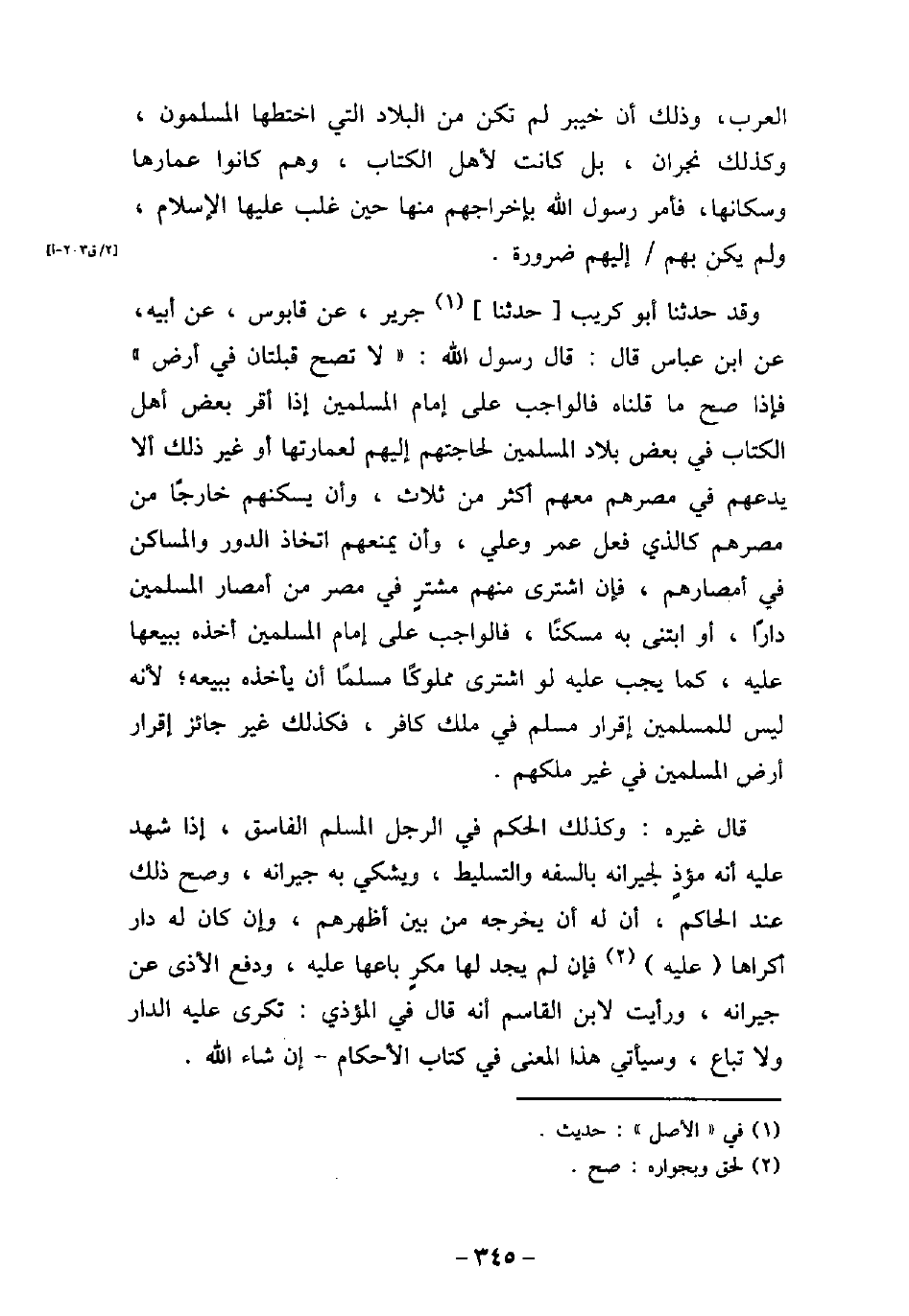 العرب، وذلك أن خيبر لم تكن من البلاد التى اختطها المسلمون وكذلك نجران بل كانت لأهل الكتاب وهم كانوا عمارهم وسكانها فأمر رسول الله بإخراجهم منها حين غلب عليهم الإسلام، ولم يكن بهم إليهم ضرورة. وقد حدثنا أبو كريب حدثنا جرير، عن قابوس، عن أبيه، عن ابن عباس قال: قال رسول الله: (لا تصح قبلتان فى أرض) فإذا صح ما قلناه فالواجب على إمام المسلمين إذا أقر بعض أهل الكتاب فى بعض بلاد المسلمين لحاجتهم إليهم لعمارتها أو غير ذلك ألا يدعهم فى مصرهم معهم أكثر من ثلاث، وأن يسكنهم خارجًا من مصرهم كالذى فعل عمر وعلى، وأن يمنعهم اتخاذ الدور والمساكن فى أمصارهم، فإن اشترى منهم مشتر فى مصر من أمصار المسلمين دارًا، أو ابتنى به مسكنًا، فالواجب على إمام المسلمين أخذه ببيعها عليه، كما يجب عليه لو اشترى مملوكًا مسلمًا أن يأخذه ببيعه؛ لأنه ليس للمسلمين إقرار مسلم فى ملك كافر، فكذلك غير جائز إقرار أرض المسلمين فى غير ملكهم. قال غيره: وكذلك الحكم فى الرجل المسلم الفاسق، إذا شهد عليه أنه مؤذ لجيرانه بالسفه والتسليط، ويشكى به جيرانه، وصح ذلك عند الحاكم، أن له أن يخرجه من بين أظهرهم، وإن كان له دار أكراها عليه، فإن لم يجد لها مكر باعها عليه، ودفع الأذى عن جيرانه، ورأيت لابن القاسم أنه قال فى المؤذى: تكرى عليه الدار ولا تباع، وسيأتى هذا المعنى فى كتاب الأحكام إن شاء الله.