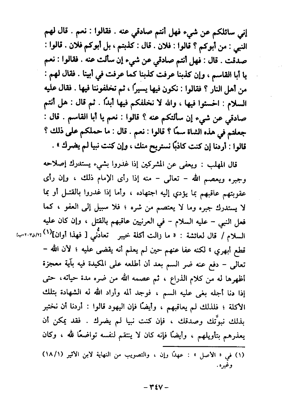 (إِنِّى سَائِلُكُمْ عَنْ شَىْءٍ، فَهَلْ أَنْتُمْ صَادِقِىَّ عَنْهُ) ؟ فَقَالُوا: نَعَمْ، قَالَ لَهُمُ النَّبِىُّ (صلى الله عليه وسلم) : (مَنْ أَبُوكُمْ) ؟ قَالُوا: فُلانٌ، قَالَ: (كَذَبْتُمْ، بَلْ أَبُوكُمْ فُلانٌ) ، قَالُوا: صَدَقْتَ، قَالَ: (فَهَلْ أَنْتُمْ صَادِقِىَّ عَنْ شَىْءٍ إِنْ سَأَلْتُ عَنْهُ، فَقَالُوا: نَعَمْ يَا أَبَا الْقَاسِمِ، وَإِنْ كَذَبْنَا عَرَفْتَ كَذِبَنَا كَمَا عَرَفْتَهُ فِى أَبِينَا، فَقَالَ لَهُمْ: (مَنْ أَهْلُ النَّار؟) قَالُوْا: نَكُونُ فِيهَا يَسِيرًا، ثُمَّ تَخْلُفُونَا فِيهَا، فَقَال (صلى الله عليه وسلم) : اخْسَئُوا فِيهَا وَاللَّهِ لاَ نَخْلُفُكُم فِيهَا أَبَدًا. ثُمَّ قَالَ: (هَلْ جَعَلْتُمْ فِى هَذِهِ الشَّاةِ سُمًّا) ؟ قَالُوا: نَعَمْ، قَالَ: (مَا حَمَلَكُمْ عَلَى ذَلِكَ) ؟ قَالُوا: أَرَدْنَا إِنْ كُنْتَ كَاذِبًا نَسْتَرِيحُ مِنْكَ، وَإِنْ كُنْتَ نَبِيًّا لَمْ يَضُرَّكَ. قال المهلب: ويعفى عن المشركين إذا غدروا بشيء يستدرك إصلاحه وجبره ويعصم الله تعالى منه إذا رأى الإمام ذلك، وإن رأى عقوبتهم عاقبهم بما يؤدى إليه اجتهاده، وأما إذا غدروا بالقتل أو بما لا يستدرك جبره وما لا يعتصم من شره؛ فلا سبيل إلى العفو، كما فعل النبى (صلى الله عليه وسلم) فى العرنيين عاقبهم بالقتل، وإن كان (صلى الله عليه وسلم) ، قال لعائشة: (ما زالت أكلة خيبر تعادنى فهذا أوان قطع أبهري) لكنه عفا عنهم حين لم يعلم أنه يقضى عليه؛ لأن الله تعالى دفع عنه ضر السم بعد أن أطلعه على المكيدة فيه بآية معجزة أظهرها له من كلام الذراع، ثم عصمه الله من ضره مدة حياته، حتى إذا دنا أجله بغى عليه السم، فوجد ألمه وأراد الله له الشهادة بتلك الأكلة؛ فلذلك لم يعاقبهم، وأيضًا فإن اليهود قالوا: أردنا أن نختبر بذلك نبوتك وصدقك، فإن كنت نبيا لم يضرك. فقد يمكن أن يعذرهم بتأويلهم، وأيضًا فإنه كان لا ينتقم لنفسه تواضعًا لله، وكان