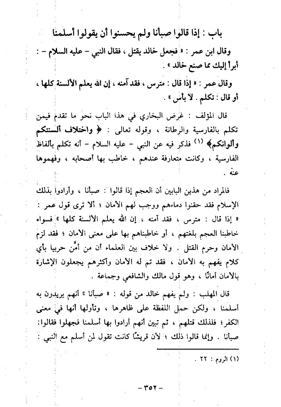 وَقَالَ ابْنُ عُمَرَ: فَجَعَلَ خَالِدٌ يَقْتُلُ، فَقَالَ النَّبِىُّ (صلى الله عليه وسلم) : (أَبْرَأُ إِلَيْكَ مِمَّا صَنَعَ خَالِدٌ) . وَقَالَ عُمَرُ: إِذَا قَالَ: مَتْرَسْ، فَقَدْ آمَنَهُ، إِنَّ اللَّهَ يَعْلَمُ الألْسِنَةَ كُلَّهَا، أَوَ قَالَ: تَكَلَّمْ، لا بَأْسَ. قال المؤلف: غرض البخارى فى هذا الباب نحو ما تقدم فيمن تكلم بالفارسية والرطانة، وقوله تعالى: (واختلاف ألسنتكم وألوانكم (فذكر فيه عن النبى (صلى الله عليه وسلم) أنه تكلم بألفاظ الفارسية، وكانت متعارفة عندهم، خاطب بها أصحابه، وفهموها عنه. فالمراد من هذين البابين أن العجم إذا قالوا: صبأنا، وأرادوا بذلك الإسلام فقد حقنوا دماءهم ووجب لهم الأمان؛ ألا ترى قول عمر: (إذا قال: مترس، فقد آمنه، إن الله يعلم الألسنة كلها) فسواء خاطبنا العجم بلغتهم، أو خاطبناهم بها على معنى الأمان؛ فقد لزم الأمان وحرم القتل. ولا خلاف بين العلماء أن من أمنَّ حربيا بأى كلام يفهم به الأمان، فقد تم له الأمان وأكثرهم يجعلون الإشارة بالأمان أمانًا، وهو قول مالك والشافعى وجماعة. قال المهلب: ولم يفهم خالد من قوله: (صبأنا) أنهم يريدون به أسلمنا، ولكن حمل اللفظة على ظاهرها، وتأولها أنها فى معنى الكفر؛ فلذلك قتلهم، ثم تبين أنهم أرادوا بها أسلمنا فجهلوا فقالوا: صبأنا. وإنما قالوا ذلك؛ لأن قريشًا كانت تقول لمن أسلم مع النبى: