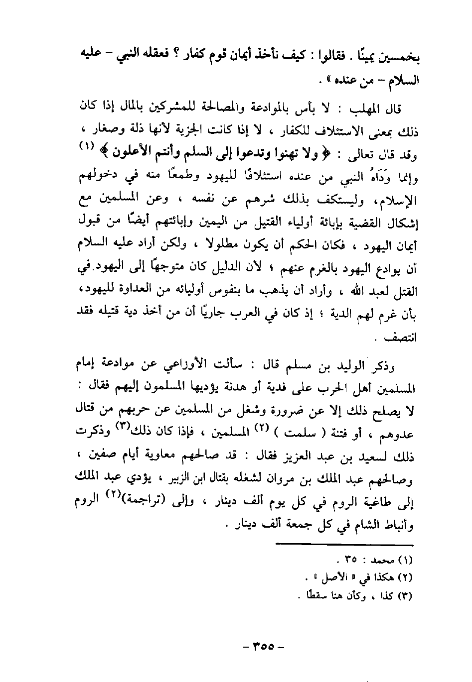 بِخَمْسِينَ) ، فَقَالُوا: كَيْفَ نَأْخُذُ أَيْمَانَ قَوْمٍ كُفَّارٍ، فَعَقَلَهُ النَّبِىُّ، (صلى الله عليه وسلم) ، مِنْ عِنْدِهِ. قال المهلب: لا بأس بالموادعة والمصالحة للمشركين بالمال إذا كان ذلك بمعنى الاستئلاف للكفار، لا إذا كانت الجزية لأنها ذلة وصغار، وقد قال تعالى: (ولا تهنوا وتدعوا إلى السلم وأنتم الأعلون (وإنما وداه النبى من عنده استئلافًا لليهود وطمعًا منه فى دخولهم الإسلام، وليستكف بذلك شرهم عن نفسه، وعن المسلمين مع إشكال القضية بإبائة أولياء القتيل من اليمين وإبائتهم أيضًا من قبول أيمان اليهود، فكان الحكم أن يكون مطلولا، ولكن أراد (صلى الله عليه وسلم) أن يوادع اليهود بالغرم عنهم؛ لأن الدليل كان متوجهًا إلى اليهود فى القتل لعبد الله، وأراد أن يذهب ما بنفوس أوليائه من العداوة لليهود، بأن غرم لهم الدية؛ إذ كان فى العرب جاريًا أن من أخذ جية قتيله فقد انتصف. وذكر الوليد بن مسلم قال: سألت الأوزاعى عن موادعة إمام المسلمين أهل الحرب على فدية أو هدنة يؤديها المسلمون إليهم فقال: لا يصلح ذلك إلا عن ضرورة وشغل من المسلمين عن حربهم من قتال عدوهم، أو فتنة (سلمت) المسلمين، فإذا كان ذلك وذكرت ذلك لسعيد بن عبد العزيز فقال: قد صالحهم معاوية أيام صفين، وصالحهم عبد الملك بن مروان لشغله بقتال ابن الزبير، يؤدى عبد الملك إلى طاغية الروم فى كل يوم ألف دينار، وإلى تراجمة الروم وأنباط الشام فى كل جمعة ألف دينار.