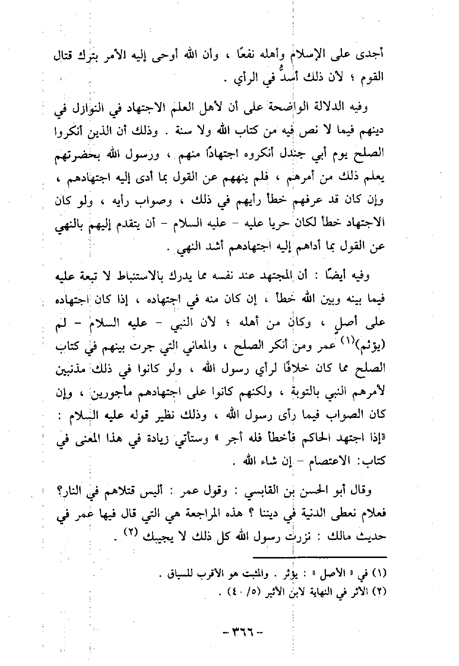أجدى على الإسلام وأهله نفعًا، وأن الله أوحى إليه الأمر بترك قتال القوم؛ لأن ذلك أسد فى الرأي. وفيه الدلالة الواضحة على أن لأهل العلم الاجتهاد فى النوازل فى دينهم فيما لا نص فيه من كتاب الله ولا سنة. وذلك أن الذين أنكروا الصلح يوم أبى جندل أنكروه اجتهادًا منهم، ورسوله الله بحضرتهم يعلم ذلك من أمرهم، فلم ينههم عن القول بما أدى إليه اجتهادهم، وإن كان قد عرفهم خطأ رأيهم فى ذلك، وصواب رأيه، ولو كان الاجتهاد خطأ لكان حريا عليه (صلى الله عليه وسلم) أن يتقدم إليهم بالنهى عن القول بما أداهم إليه اجتهادهم أشد النهي. وفيه أيضًا: أن المجتهد عند نفسه مما يدرك بالاستنباط لا تبعة عليه فيما بينه وبين الله خطأ، إن كان منه فى اجتهاده، إذا كان اجتهاده على أصل، وكان من أهله؛ لأن النبى (صلى الله عليه وسلم) لم يؤثم عمر ومن أنكر الصلح، والمعانى التى جرت بينهم فى كتاب الصلح مما كان خلافًا لرأى رسول الله، ولو كانوا فى ذلك مذنبين لأمرهم النبى بالتوبة، ولكنهم كانوا على اجتهادهم مأجورين، وإن كان الصواب فيما رأى رسول الله، وذلك نظير قوله (صلى الله عليه وسلم) : (إذا اجتهد الحاكم فأخطأ فله أجر) وستأتى زيادة فى هذا المعنى فى كتاب: الاعتصام إن شاء الله. وقال أبو الحسن بن القابسى: وقول عمر: أليس قتلادهم فى النار؟ فعلام نعطى الدنية فى ديننا؟ هذه المراجعة هى التى قال فيها عمر فى حديث مالك: نزرت رسول الله كل ذلك لا يجيبك.