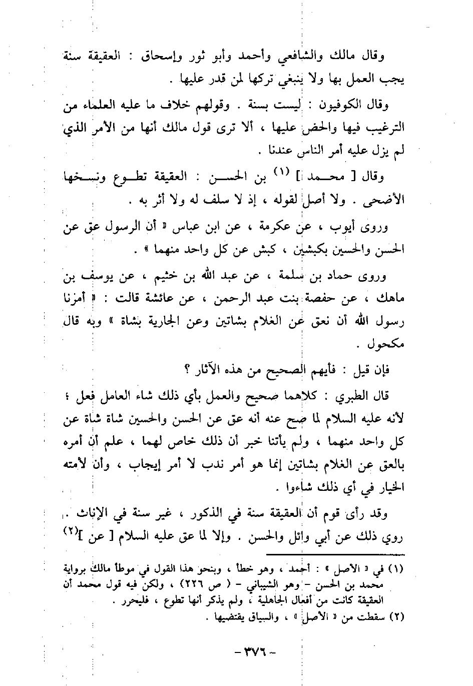 وقال مالك والشافعى وأحمد وأبو ثور وإسحاق: العقيقة سنة يجب العمل بها ولا ينبغى تركها لمن قدر عليها. وقال الكوفيون: ليست بسنة. وقولهم خلاف ما عليه العلماء من الترغيب فيها والحض عليها، ألا ترى قول مالك أنها من الأمر الذى لم يزل عليه أمر الناس عندنا. وقال محمد بن الحسن: العقيقة تطوع ونسخها الأضحى. ولا أصل لقوله، إذ لاسلف له ولا أثر به. وروى أيوب، عن عكرمة، عن ابن عباس: (أن الرسول عق عن الحسن والحسين بكبشين، كبش عن كل واحد منهما) . وروى حماد بن سلمة، عن عبد الله بن خثيم، عن يوسف بن ماهك، عن حفصة بنت عبد الرحمن، عن عائشة قالت: (أمرنا رسول الله أن نعق عن الغلام بشاتين وعن الجارية بشاة) وبه قال مكحول. فإن قيل: فأيهم الصحيح من هذه الآثار؟ قال الطبرى: كلاهما صحيح والعمل بأى ذلك شاء العامل فعل؛ لأنه (صلى الله عليه وسلم) لما صح عنه أنه عق عن الحسن والحسين شاة شاة عن كل واحد منهما، ولم يأتنا خبر أن ذلك خاص لهما، علم أن أمره بالعق عن الغلام بشاتين إنما هو أمر ندب لا أمر إيجاب، وأن لأمته الخيار فى أى ذلك شاءوا. وقد رأى قوم أن العقيقة سنة فى الذكور، غير سنة فى الإناث. روى ذلك عن أبى وائل والحسن. وإلا لما عق - عليه السلام -، عن