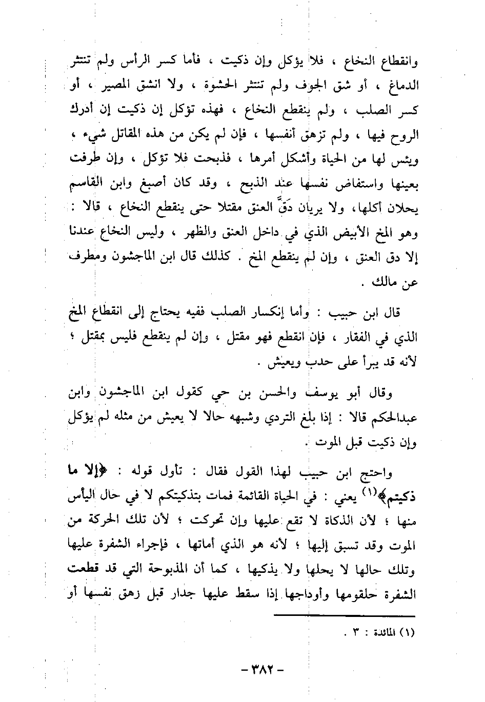 وانقطاع النخاع، فلا يؤكل وإن ذكيت، فأما كسر الرأس ولم تنتثر الدماغ، أو شق الجوف ولم تنتثر الحشوة، ولا انشق المصير، أو كسر الصلب، ولم ينقطع النخاع، فهذه تؤكل إن ذكيت إن أدرك الروح فيها، ولم تزهق أنفسها، فإن لم يكن من هذه المقاتل شيء، ويئس لها من الحياة وأشكل أمرها، فذبحت فلا تؤكل، وإن طرفت بعينها واستفاض نفسها عند الذبح، وقد كان أصبغ وابن القاسم يحلان أكلها، ولا يريان دق العنق مقتلا حتى ينقطع النخاع، قالا: وهو المخ الأبيض الذى فى داخل العنق والظهر، وليس النخاع عندنا إلا دق العنق، وإن لم ينقطع المخ. كذلك قال ابن الماجشون ومطرف عن مالك. قال ابن حبيب: وأما انكسار الصلب ففيه يحتاج إلى انقطاع المخ الذى فى الفقار، فإن انقطع فهو مقتل، وإن لم ينقطع فليس بمقتل؛ لأنه قد يبرأ على حدب ويعيش. وقال أبو يوسف والحسن بن حيى كقول ابن الماجشون وابن عبد الحكم قالا: إذا بلغ التردى وشبهه حالا لا يعيش من مثله لم يؤكل وإن ذكيت قبل الموت. واحتج ابن حبيب لهذا القول فقال: تأول قوله: (إلا ما ذكيتم (يعنى: فى الحياة القائمة فمات بتذكيتكم لا فى حال اليأس منها؛ لأن الذكاة لا تقع عليها وإن تحركت؛ لأن تلك الحركة من الموت وقد تسبق إليها؛ لأنه هو الذى أماتهم، فإجراء الشفرة عليها وتلك حالها لا يحلها ولا يذكيها، كما أن المذبوحة التى قد قطعت الشفرة حلقومها وأوداجها إذا سقط عليها جدار قبل زهق نفسها أو