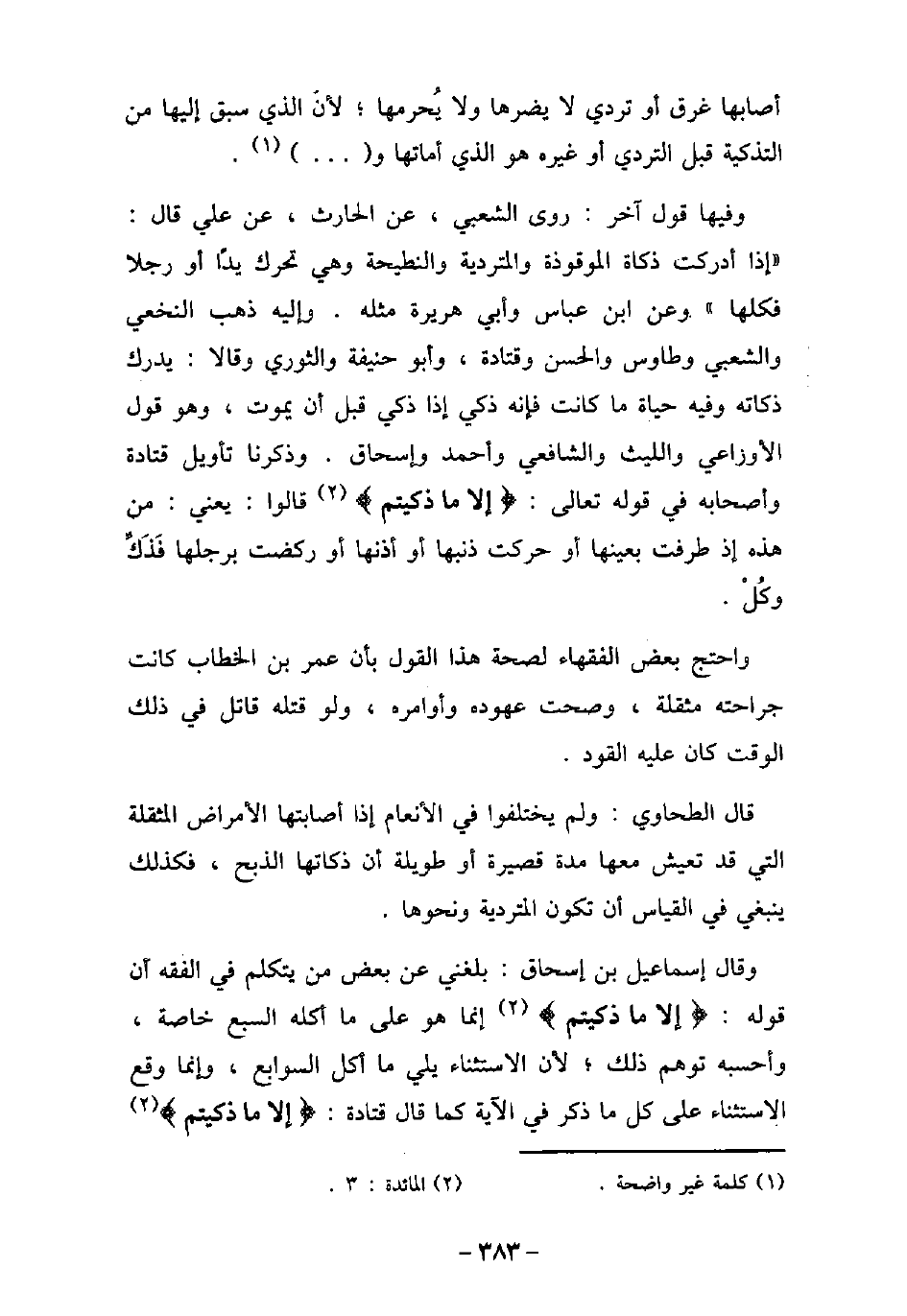 أصابها غرق أو تردى لا يضرها ولا يحرمها؛ لأن الذى سبق إليها من التذكية قبل التردى أو غيره هو الذى أماتها و [. . . .] . وفيها قول آخر: روى الشعبى، عن الحارث، عن على قال: (إذا أدركت ذكاة الموقوذة والمتردية والنطيحة وهى تحرك يدًا أو رجلا فكلها) وعن ابن عباس وأبى هريرة مثله. وإليه ذهب النخعى والشعبى وطاوس والحسن وقتادة، وأبو حنيفة والثورى وقالا: يدرك ذكاته وفيه حياة ما كانت فإنه ذكى إذا ذكى قبل أن يموت، وهو قول الأوزاعى والليث والشافعى وأحمد وإسحاق. وذكرنا تأويل قتادة وأصحابه فى قوله تعالى: (إلا ما ذكيتم (قالوا: يعنى: من هذه إذ طرفت بعينها أو حركت ذنبها أو أذنها أو ركضت برجلها فذك وكل. واحتج بعض الفقهاء لصحة هذا القول بأن عمر بن الخطاب كانت جراحته مثقلة، وصحت عهوده وأوامره، ولو قتله قاتل فى ذلك الوقت كان عليه القود. قال الطحاوى: ولم يختلفوا فى الأنعام إذا أصابتها الأمراض المثقلة التى قد تعيش معها مدة قصيرة أو طويلة أن ذكاتها الذبح، فكذلك ينبغى فى القياس أن تكون المتردية ونحوها. وقال إسماعيل بن إسحاق: بلغنى عن بعض من يتكلم فى الفقه أن قوله: (إلا ما ذكيتم (إنما هو على ما أكله السبع خاصة، وأحسبه توهم ذلك؛ لأن الاستثناء يلى ما أكل السوابع، وإنما وقع الاستثناء على كل ما ذكر فى الآية كما قال قتادة: (إلا ما ذكيتم (