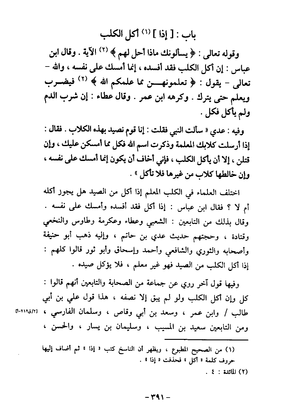 وَقَوْلُهُ تَعَالَى: (يَسْأَلُونَكَ مَاذَا أُحِلَّ لَهُمْ) [المائدة: 4] الآية. وَقَالَ ابْنُ عَبَّاسٍ: إِنْ أَكَلَ الْكَلْبُ، فَقَدْ أَفْسَدَهُ، إِنَّمَا أَمْسَكَ عَلَى نَفْسِهِ، وَاللَّهُ تَعَالَى يَقُولُ: (تُعَلِّمُونَهُنَّ مِمَّا عَلَّمَكُمُ اللَّهُ (فَيضْرَبُ وَيُعَلَّمُ حَتَّى يَتْرُكَ، وَكَرِهَهُ ابْنُ عُمَرَ. وَقَالَ عَطَاءٌ: إِنْ شَرِبَ الدَّمَ وَلَمْ يَأْكُلْ فَكُلْ. 2007 / - وفيه: عَدِىّ، سَأَلْتُ النَّبِىّ (صلى الله عليه وسلم) ، فَقُلْتُ: إِنَّا قَوْمٌ نَصِيدُ بِهَذِهِ الْكِلابِ، فَقَالَ: (إِذَا أَرْسَلْتَ كِلابَكَ الْمُعَلَّمَةَ، وَذَكَرْتَ اسْمَ اللَّهِ، فَكُلْ مِمَّا أَمْسَكْنَ عَلَيْكُمْ، وَإِنْ قَتَلْنَ إِلا أَنْ يَأْكُلَ الْكَلْبُ، فَإِنِّى أَخَافُ أَنْ يَكُونَ إِنَّمَا أَمْسَكَهُ عَلَى نَفْسِهِ، وَإِنْ خَالَطَهَا كِلابٌ مِنْ غَيْرِهَا فَلا تَأْكُلْ) . اختلف العلماء فى الكلب المعلم إذا أكل من الصيد هل يجوز أكله أم لا؟ فقال ابن عباس: إذا أكل فقد أفسده وأمسك على نفسه. وقال بذلك من التابعين: الشعبى وعطاء وعكرمة وطاوس والنخعى وقتادة، وحجتهم حديث عدى بن حاتم، وإليه ذهب أبو حنيفة وأصحابه والثورى والشافعى وأحمد وإسحاق وأبو ثور قالوا كلهم: إذا أكل الكلب من الصيد فهو غير معلم، فلا يؤكل صيده. وفيها قول آخر روى عن جماعة من الصحابة والتابعين أنهم قالوا: كل وإن أكل الكلب ولو لم يبق إلا نصفه، وهذا قول على بن أبى طالب وابن عمر، وسعد بن أبى وقاص، وسلمان الفارسى، ومن التابعين سعيد بن المسيب، وسليمان بن يسار، والحسن،