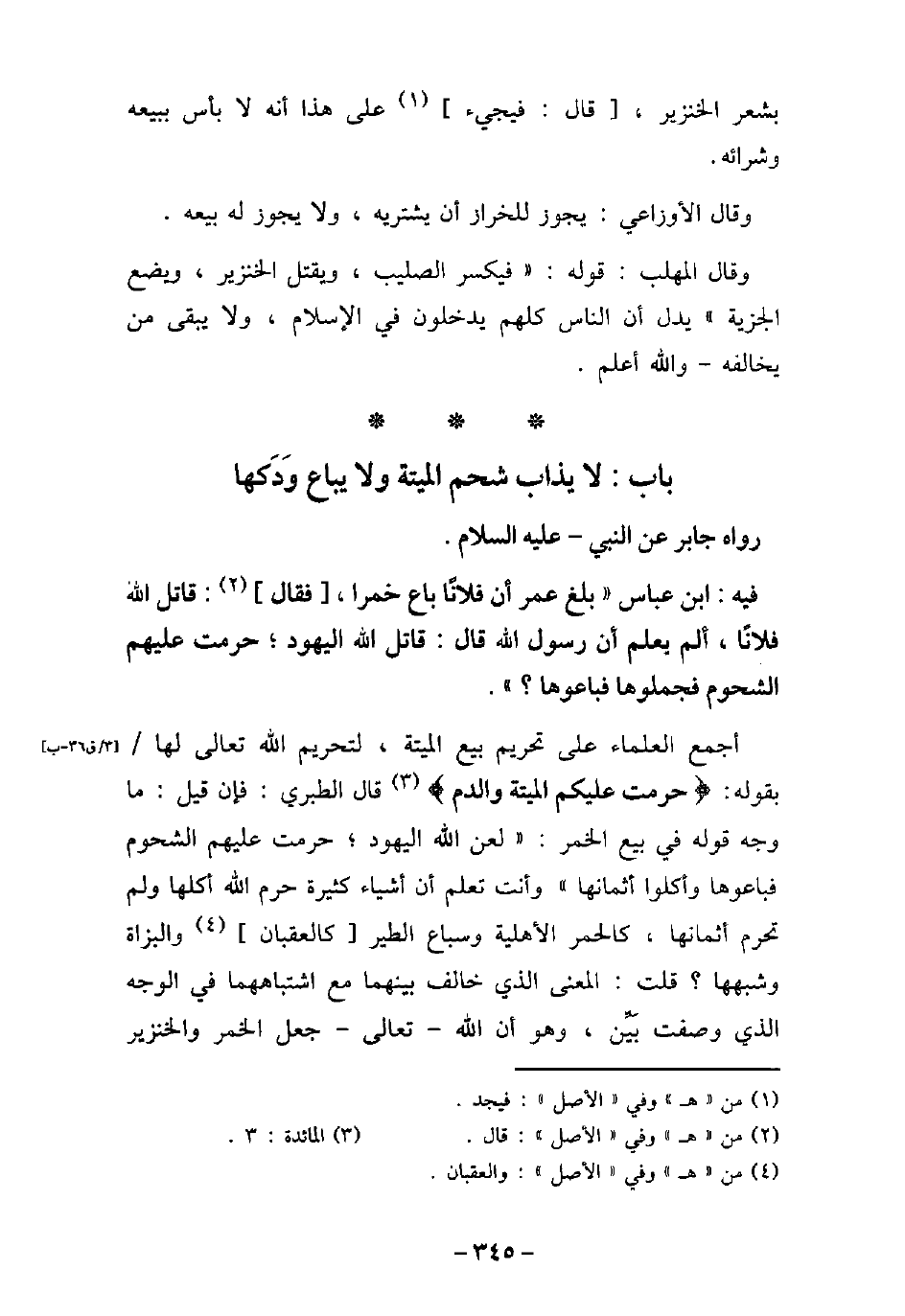 رَوَاهُ جَابِرٌ عَنِ النَّبِىِّ، عليه السَّلام. / 143 - فيه: ابْن عَبَّاس، بَلَغَ عُمَرَ أَنَّ فُلاَنًا بَاعَ خَمْرًا، فَقَالَ: قَاتَلَ اللَّهُ فُلاَنًا، أَلَمْ يَعْلَمْ أَنَّ رَسُولَ اللَّهِ (صلى الله عليه وسلم) قَالَ: (قَاتَلَ اللَّهُ الْيَهُودَ، حُرِّمَتْ عَلَيْهِمُ الشُّحُومُ، فَجَمَلُوهَا فَبَاعُوهَا؟) . أجمع العلماء على تحريم بيع الميتة، لتحريم الله تعالى لها بقوله: (حرمت عليكم الميتة والدم (قال الطبرى: فإن قيل: ما وجه قوله فى بيع الخمر: (لعن الله اليهود، حرمت عليهم الشحوم فباعوها وأكلوا أثمانها) وأنت تعلم أن أشياء كثيرة حرم الله أكلها ولم تحرم أثمانها، كالحمر الأهلية وسباع الطير كالعقبان والبزاة وشبهها؟ قلت: المعنى الذى خالف بينهما مع اشتباههما فى الوجه الذى وصفت بين، وهو أن الله - تعالى - جعل الخمر والخنزير