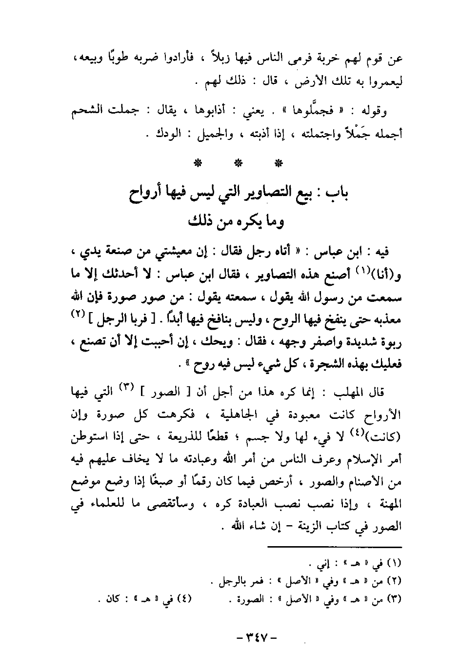 / 144 - فيه: ابْن عَبَّاس، أَتَاهُ رَجُلٌ فَقَالَ: إن مَعِيشَتِى مِنْ صَنْعَةِ يَدِى، وَإِنِّا أَصْنَعُ هَذِهِ التَّصَاوِيرَ، فَقَالَ ابْنُ عَبَّاسٍ: لاَ أُحَدِّثُكَ إِلاَ مَا سَمِعْتُ من رَسُولَ اللَّهِ (صلى الله عليه وسلم) يَقُولُ، سَمِعْتُهُ يَقُولُ: (مَنْ صَوَّرَ صُورَةً، فَإِنَّ اللَّهَ مُعَذِّبُهُ حَتَّى يَنْفُخَ فِيهَا الرُّوحَ، وَلَيْسَ بِنَافِخٍ فِيهَا أَبَدًا) ، فَرَبَا الرَّجُلُ رَبْوَةً شَدِيدَةً، وَاصْفَرَّ وَجْهُهُ، فَقَالَ: وَيْحَكَ، إِنْ أَبَيْتَ إِلاَ أَنْ تَصْنَعَ فَعَلَيْكَ بِهَذَهِ الشَّجَرِةِ كُلِّ شَىْءٍ لَيْسَ فِيهِ رُوحٌ) . قال المهلب: إنما كره هذا من أجل أن الصور التى فيها الأرواح كانت معبودة فى الجاهلية، فكرهت كل صورة وإن كانت لا فىء لها ولا جسم؛ قطعًا للذريعة، حتى إذا استوطن أمر الإسلام وعرف الناس من أمر الله وعبادته ما لا يخاف عليهم فيه من الأصنام والصور، أرخص فيما كان رقمًا أو صبغًا إذا وضع موضع المهنة، وإذا نصب نصب العبادة، وسأتقصى ما للعلماء فى الصور فى كتاب الزينة - إن شاء الله.