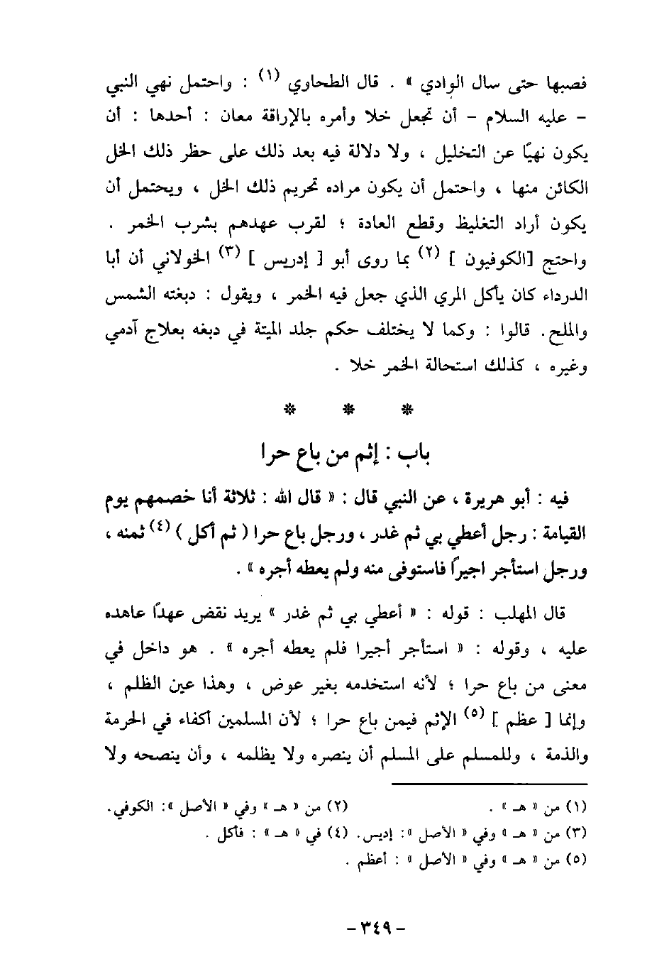 / 146 - فيه: أَبُو هُرَيْرَةَ، عَنِ النَّبِىِّ (صلى الله عليه وسلم) قَالَ: (قَالَ اللَّهُ: ثَلاَثَةٌ أَنَا خَصْمُهُمْ يَوْمَ الْقِيَامَةِ: رَجُلٌ أَعْطَى بِى، ثُمَّ غَدَرَ، وَرَجُلٌ بَاعَ حُرًّا، ثُمَّ أَكَلَ ثَمَنَهُ، وَرَجُلٌ اسْتَأْجَرَ أَجِيرًا، فَاسْتَوْفَى مِنْهُ وَلَمْ يُعْطِ أَجْرَهُ) . قال المهلب: قوله: (أعطى بى ثم غدر) يريد نقض عهدًا عاهده عليه، وقوله: (استأجر أجيرا فلم يعطه أجره) ، هو داخل فى معنى من باع حرًا؛ لأنه استخدمه بغير عوض، وهذا عين الظلم، وإنما عظم الإثم فيمن باع حرا؛ لأن المسلمين أكفاء فى الحرمة والذمة، وللمسلم على المسلم أن ينصره ولا يظلمه، وأن ينصحه ولا