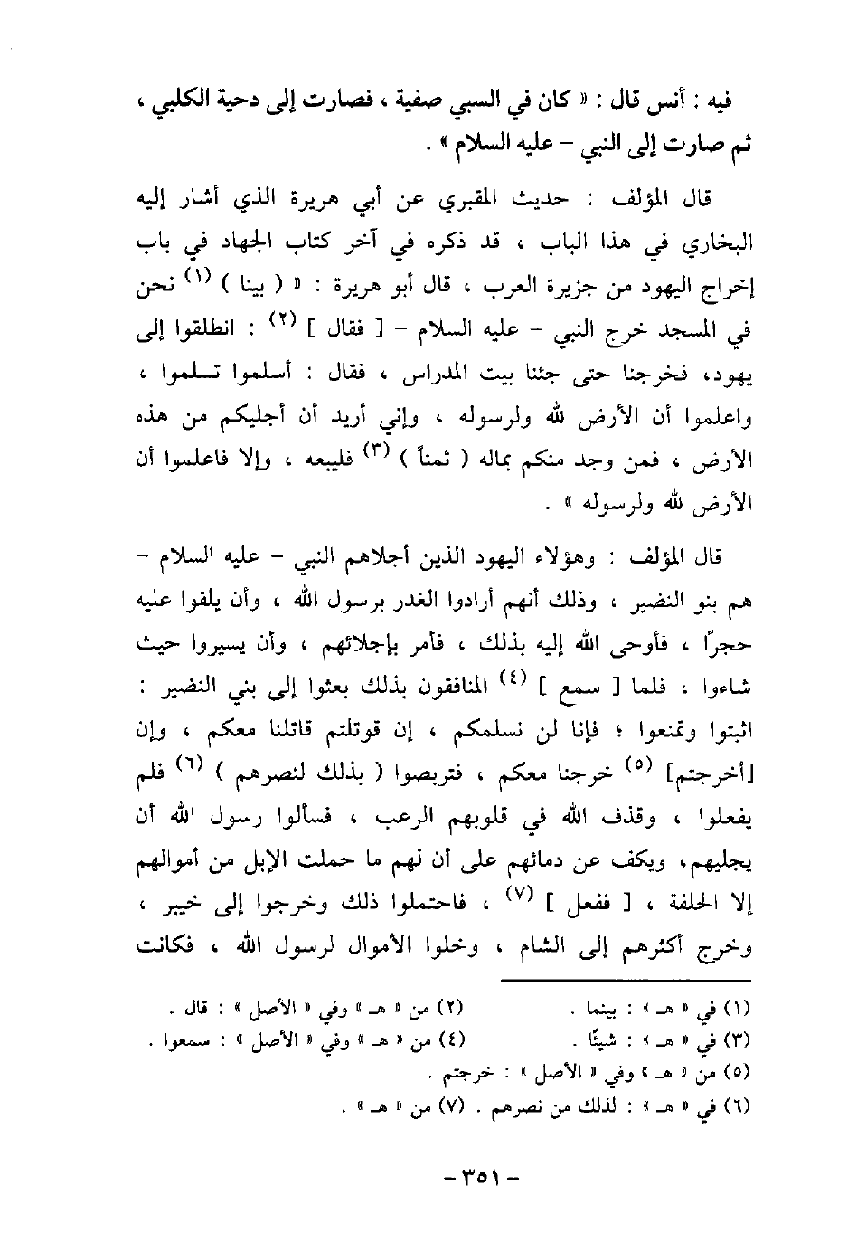 / 148 - فيه: أَنَس، قَالَ: كَانَ فِى السَّبْىِ صَفِيَّةُ، فَصَارَتْ إِلَى دَحْيَةَ الْكَلْبِىِّ، ثُمَّ صَارَتْ إِلَى النَّبِىِّ، عليه السَّلام. قال المؤلف: حديث المقبرى عن أبى هريرة الذى أشار إليه البخارى فى هذا الباب، قد ذكره فى آخر كتاب الجهاد، فى باب: إخراج اليهود من جزيرة العرب، قال أبو هريرة: (بينا نحن فى المسجد خرج النبى - عليه السلام - فقال: انطلقوا إلى يهود، فخرجنا حتى جئنا بيت المدراس، فقال: أسلموا، واعلموا أن الأرض لله ولرسوله، وإنى أريد أن أجليكم من هذه الأرض، فمن وجد منكم بماله ثمنًا فليبعه، وإلا فاعلموا أن الأرض لله ولرسوله) . قال المؤلف: وهؤلاء اليهود الذين أجلاهم النبى - عليه السلام - هم بنو النضير، وذلك أنهم أرادوا الغدر برسول الله، وأن يلقوا عليه حجرًا، فأوحى الله إليه بذلك، فأمر بإجلائهم، وأن يسيروا حيث شاءوا، فلما سمع المنافقون بذلك بعثوا إلى بنى النضير: اثبتوا وتمنعوا؛ فإنا لن نسلمكم، إن قوتلتم قاتلنا معكم، وإن أخرجتم خرجنا معكم، فتربصوا بذلك لنصرهم فلم يفعلوا، وقذف الله فى قلوبهم الرعب، فسألوا رسول الله أن يجليهم، ويكف عن دمائهم على أن لهم ما حملت الإبل من أموالهم إلا الحلفة، ففعل، فاحتملوا ذلك وخرجوا إلى خيبر، وخرج أكثرهم إلى الشام، وخلوا الأموال لرسول الله، فكانت