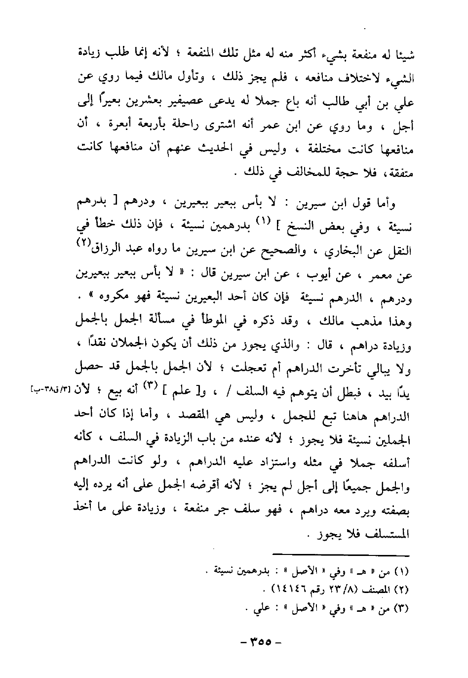 شيئًا له منفعة بشىء أكثر منه له مثل تلك المنفعة؛ لأنه إنما طلب زيادة الشىء لاختلاف منافعه، فلم يجز ذلك، وتأول مالك فيما روى عن على بن أبى طالب أنه باع جملا له يدعى عصيفير بعشرين بعيرًا إلى أجل، وما روى عن ابن عمر أنه اشترى راحلة بأربعة أبعرة، أن منافعها كانت مختلفة، وليس فى الحديث عنهم أن منافعها كانت متفقة، فلا حجة للمخالف فى ذلك. وأما قول ابن سيرين: لا بأس ببعير ببعيرين، ودرهم بدرهم نسيئة، وفى بعض النسخ بدرهمين نسيئة، فإن ذلك خطأ فى النقل عن البخارى، والصحيح عن ابن سيرين ما رواه عبد الرزاق، عن معمر، عن أيوب، عن ابن سيرين قال: (لا بأس ببعير ببعيرين وردهم، والدرهم نسيئة فإن كان أحد البعيرين نسيئة فهو مكروه) وهذا مذهب مالك، وقد ذكره فى الموطأ فى مسألة الجمل بالجمل وزيادة دراهم، قال: والذى يجوز من ذلك أن يكون الجملان نقدًا، ولا يبالى تأخرت الدراهم أم تعجلت؛ لأن الجمل بالجمل قد حصل يدًا بيد، فبطل أن يتوهم فيه السلف، وأعلم أنه بيع؛ لأن الدراهم هاهنا تبع للجمل، وليس هى المقصد، وأما إذا كان أحد الجملين نسيئة فلا يجوز؛ لأنه عنده من باب الزيادة فى السلف، كأنه أسلفه جملا فى مثله واستزاد عليه الدراهم، ولو كانت الدراهم والجمل جميعًا إلى أجل لم يجز؛ لأنه أقرضه الجمل على أنه يرده إليه بصفته ويرد معه دراهم، فهو سلف جر منفعة، وزيادة على ما أخذ المستسلف فلا يجوز.