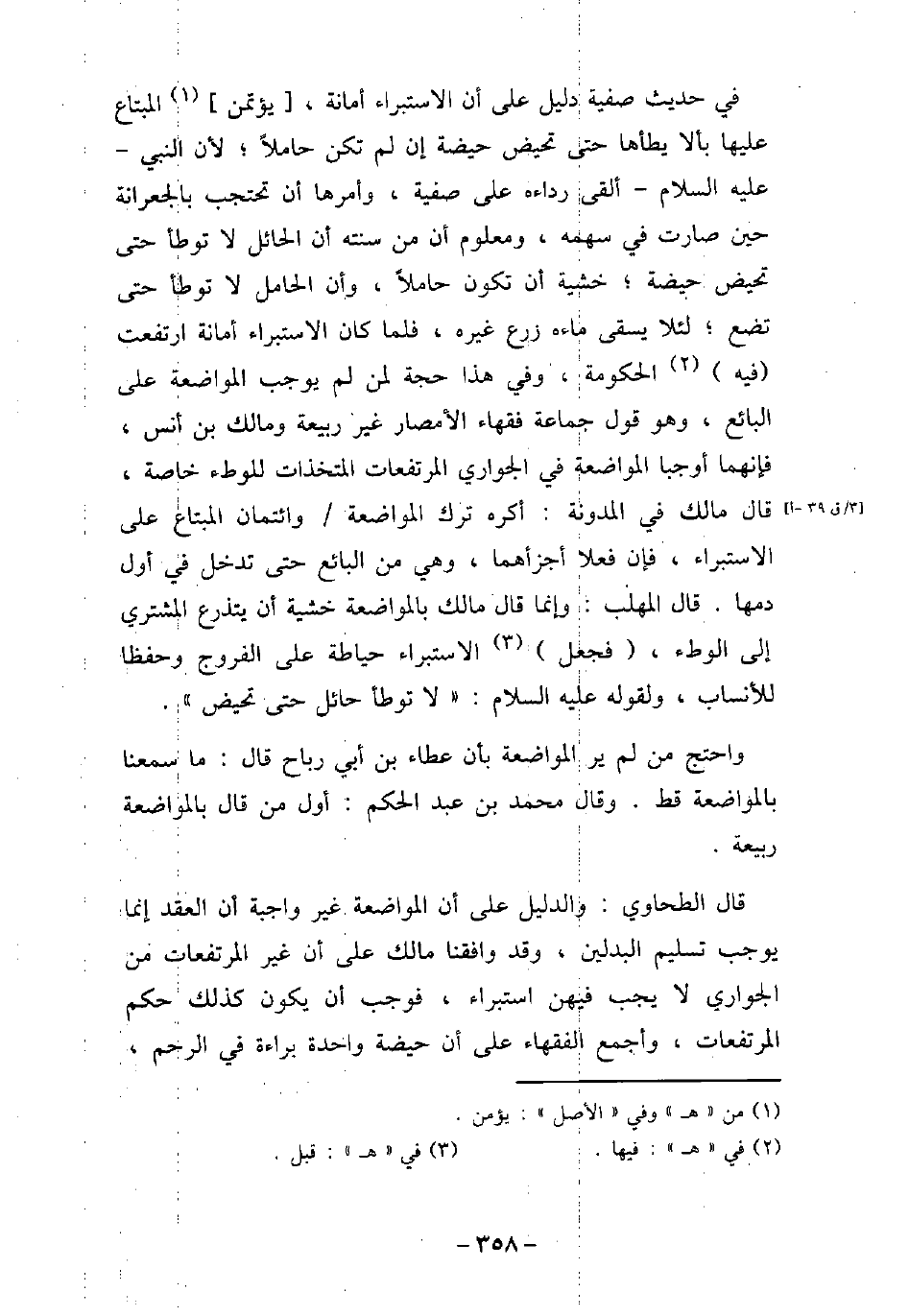 حديث صفية دليل على أن الاستبراء أمانة، يؤتمن المبتاع عليها بألا يطأها حتى تحيض حيضة إن لم تكن حاملاً؛ لأن النبى - عليه السلام - ألقى رداءه على صفية، وأمرها أن تحتجب بالجعرانة حين صارت فى سهمه، ومعلوم أن من سنته أن الحائل لا توطأ حتى تحيض حيضة؛ خشية أن تكون حاملاً، وأن الحامل لا توطأ حتى تضع؛ لئلا يسقى ماءه زرع غيره، فلما كان الاستبراء أمانة ارتفعت فيه الحكومة، وفى هذا حجة لمن لم يوجب المواضعة على البائع، وهو قول جماعة فقهاء الأمصار غير ربيعة ومالك بن أنس، فإنهما أوجبا المواضعة فى الجوارى المرتفعات المتخذات للوطء خاصة، قال مالك فى المدونة: أكره ترك المواضعة وائتمان المبتاع على الاستبراء، فإن فعلا أجزأهما، وهى من البائع حتى تدخل فى أول دمها. قال المهلب: وإنما قال مالك بالمواضعة خشية أن يتذرع المشترى إلى الوطء، فجعل الاستبراء حياطة على الفروج وحفظا للأنساب، ولقوله عليه السلام: (لا توطأ حائل حتى تحيض) . وأحتج من لم ير المواضعة بأن عطاء بن أبى رباح قال: ما سمعنا بالمواضعة قط. وقال محمد بن عبد الحكم: أول من قال بالمواضعة ربيعة. قال الطحاوى: والدليل على أن المواضعة غير واجبة أن العقد إنما يوجب تسليم البدلين، وقد وافقنا مالك على أن غير المرتفعات من الجوارى لا يجب فيهن استبراء، فوجب أن يكون كذلك حكم المرتفعات، وأجمع الفقهاء على أن حيضة واحدة براءة فى الرحم،
