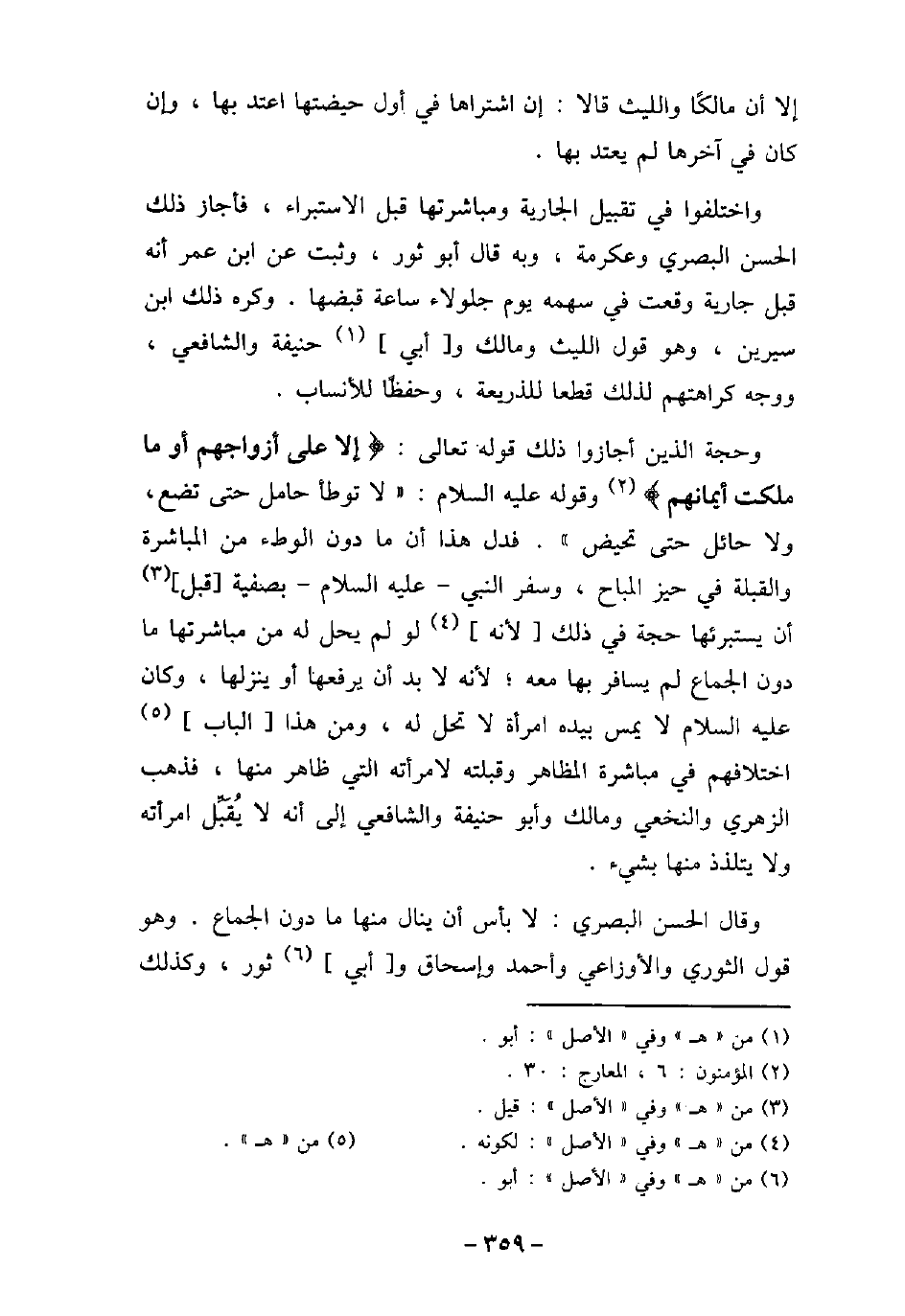 إلا أن مالكًا والليث قالا: إن اشتراها فى أول حيضتها اعتد بها، وإن كان فى آخرها لم يعتد بها. واختلفوا فى تقبيل الجارية ومباشرتها قبل الاستبراء، فأجاز ذلك الحسن البصرى وعكرمة، وبه قال أبو ثور، وثبت عن ابن عمر أنه قبل جارية وقعت فى سهمه يوم جلولاء ساعة قبضها. وكره ذلك ابن سيرين، وهو قول الليث ومالك وأبى حنيفة والشافعى، ووجه كراهتهم لذلك قطعا للذريعة، وحفظاُ للانساب. وحجة الذين أجازوا ذلك قوله تعالى: (إلا على أزواجهم أو ما ملكت أيمانهم (وقوله عليه السلام: (لا توطأ حامل حتى تضع، ولا حائل حتى تحيض) . فدل هذا أن ما دون الوطء من المباشرة والقبلة فى حيز المباح وسفر النبى عليه السلام بصفية قبل أن يستبرئها حجة فى ذلك لأنه لو لم يحل له من مباشرتها ما دون الجماع لم يسافر بها معه، لأنه لا بد أن يرفعها أو ينزلها، وكان عليه السلام لا يمس بيده امرأة لا تحل له، ومن هذا الباب اختلافهم فى مباشرة المظاهر وقبلته لامرأته التى ظاهر منها، فذهب الزهرى والنخعى ومالك وأبو حنيفة والشافعى إلى أنه لا يقبل امرأته ولا يتلذذ منها بشىء. وقال الحسن البصرى: لا بأس أن ينال منها ما دون الجماع. وهو قول الثورى والأوزاعى وأحمد وإسحاق وأبى ثور، وكذلك