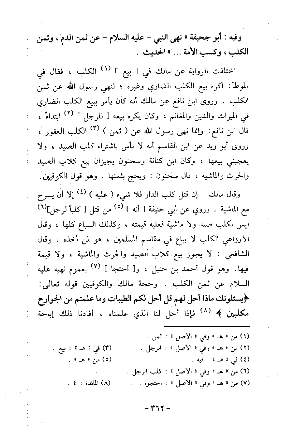 / 155 - وفيه: أَبُو جُحَيْفَةَ، نَهَى النَّبِىّ عَنْ ثَمَنِ الدَّمِ، وَثَمَنِ الْكَلْبِ، وَكَسْبِ الأَمَةِ. . . الحديث. اختلفت الرواية عن مالك فى بيع الكلب، فقال فى الموطأ: أكره بيع الكلب الضارى وغيره؛ لنهى رسول الله عن ثمن الكلب. وروى ابن نافع عن مالك أنه كان يأمر ببيع الكلب الضارى فى الميراث والدين والمغانم، وكان يكره بيعه للرجل ابتداءً، قال ابن نافع: وإنما نهى رسول الله عن ثمن الكلب العقور، وروى أبو زيد عن ابن القاسم أنه لا بأس باشتراء كلب الصيد، ولا يعجبنى بيعها، وكان ابن كنانة وسحنون يجيزان بيع كلاب الصيد والحرث والماشية، قال سحنون: ويحج بثمنها، وهو قول الكوفيين. وقال مالك: إن قتل كلب الدار فلا شىء عليه إلا أن يسرح مع الماشية. وروى عن أبى حنيفة أنه من قتل كلبًا لرجل ليس بكلب صيد ولا ماشية فعليه قيمته، وكذلك السباع كلها، وقال الأوزاعى الكلب لا يباع فى مقاسم المسلمين، هو لمن أخذه، وقال الشافعى: لا يجوز بيع كلاب الصيد والحرث والماشية، ولا قيمة فيها. وهو قول أحمد بن حنبل، احتجا بعموم نهيه عليه السلام عن ثمن الكلب. وحجة مالك والكوفيين قوله تعال: (يسئلونك ماذا أحل لهم قل أحل لكم الطيبات وما علمتم من الجوارح مكلبين (فإذا أحل لنا الذى علمناه، أفادنا ذلك إباحة
