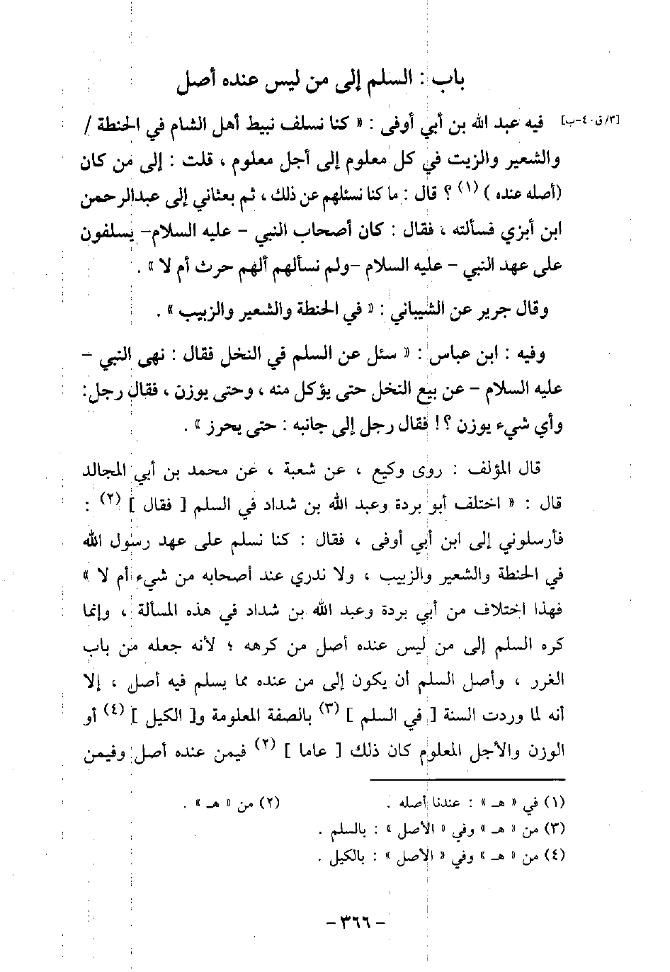 / 3 - فيه: عَبْد اللَّه بِن أَبِى أَوْفَى، كُنَّا نُسْلِفُ نَبِيطَ أَهْلِ الشَّأْمِ فِى الْحِنْطَةِ وَالشَّعِيرِ وَالزَّيْتِ فِى كَيْلٍ مَعْلُومٍ إِلَى أَجَلٍ مَعْلُومٍ، قُلْتُ: إِلَى مَنْ كَانَ أَصْلُهُ عِنْدَهُ؟ قَالَ: مَا كُنَّا نَسْأَلُهُمْ عَنْ ذَلِكَ، ثُمَّ بَعَثَانِى إِلَى عَبْدِالرَّحْمَنِ بْنِ أَبْزَى، فَسَأَلْتُهُ، فَقَالَ: كَانَ أَصْحَابُ النَّبِىِّ، عليه السَّلام، يُسْلِفُونَ عَلَى عَهْدِ النَّبِىِّ، عليه السَّلام، وَلَمْ نَسْأَلْهُمْ أَلَهُمْ حَرْثٌ أَمْ لاَ؟ . وَقَالَ: جَرِيرٌ، عَنِ الشَّيْبَانِىِّ: فِى الْحِنْطَةِ وَالشَّعِيرِ وَالزَّبِيبِ. / 4 - وفيه: ابْن عَبَّاس، سُئل عَنِ السَّلَمِ فِى النَّخْلِ، قَالَ: نَهَى النَّبِىُّ، عليه السَّلام، عَنْ بَيْعِ النَّخْلِ، حَتَّى يُؤكَلَ مِنْهُ، وَحَتَّى يُوزَنَ، فَقَالَ الرَّجُلُ: وَأَىُّ شَىْءٍ يُوزَنُ؟ قَالَ رَجُلٌ إِلَى جَانِبِهِ: حَتَّى يُحْرَزَ. قال المؤلف: روى وكيع، عن شعبة، عن محمد بن أبى المجالد قال: (اختلف أبو بردة وعبد الله بن شداد فى السلم فقال: فأرسلونى إلى ابن أبى أوفى، فقال: كنا نسلم على عهد رسول الله فى الحنطة والشعير والزبيب، ولا ندرى عند أصحابه من شىء أم لا) فهذا اختلاف من أبى بردة وعبد الله بن شداد فى هذه المسألة وإنما كره السلم إلى من ليس عنده أصل من كرهه؛ لأنه جعله من باب الغرر، وأصل السلم أن يكون إلى من عنده مما يسلم فيه أصل، إلا أنه لما وردت السنة فى السلم بالصفة المعلومة والكيل أو الوزن والأجل المعلوم كان ذلك عاما فيمن عنده أصل وفيمن